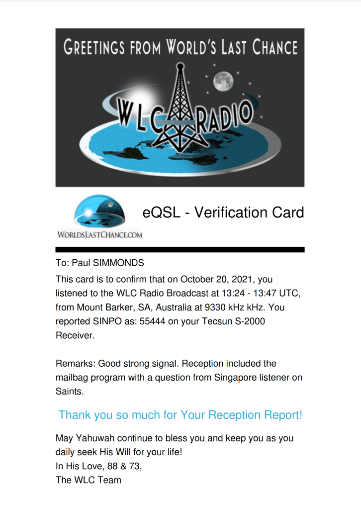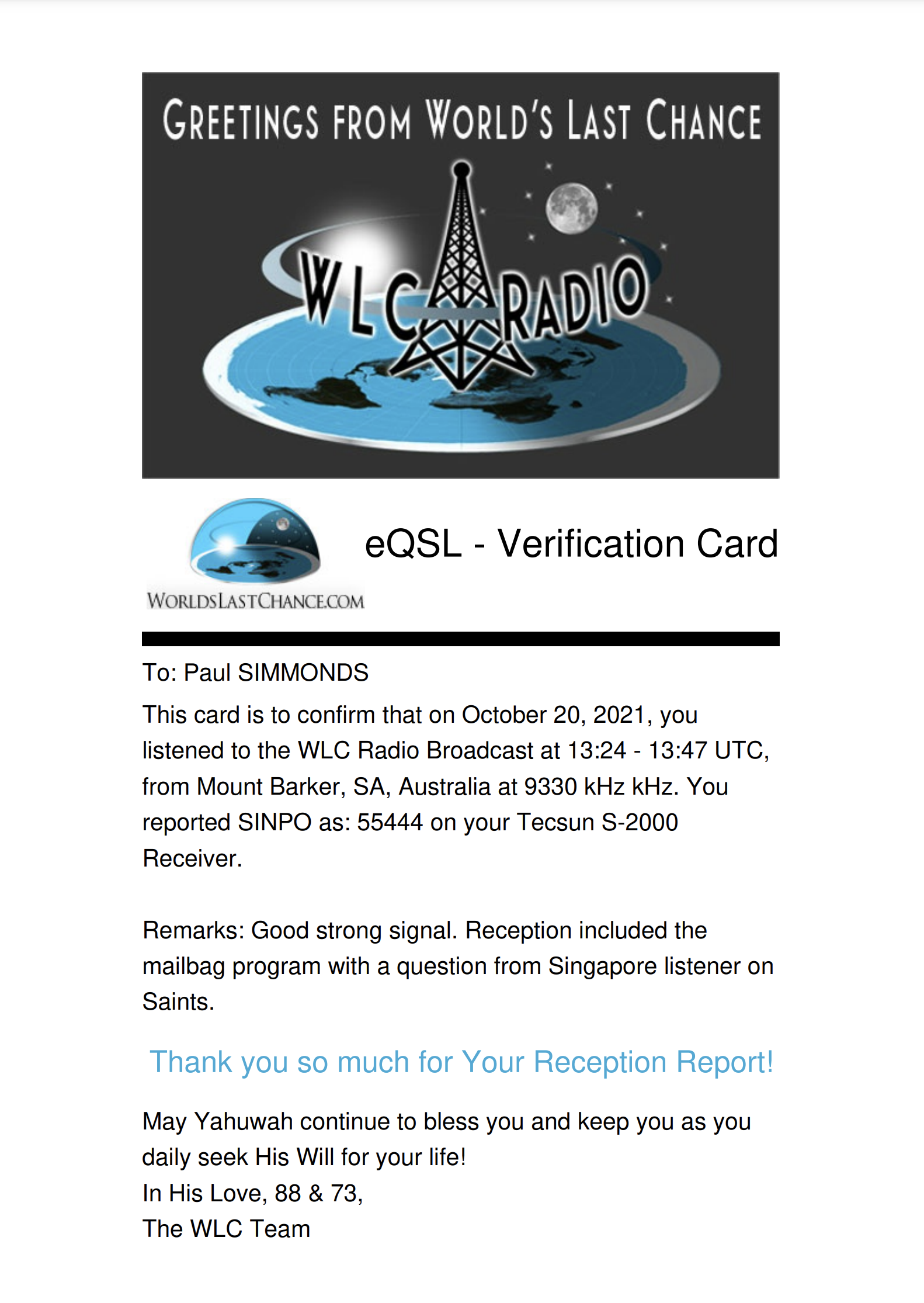 On 10th October 2021 I tuned into WBCQ on 9330 kHz. I submitted an on-line reception report and received a very prompt email response. Below is eQSL Verification Card received.