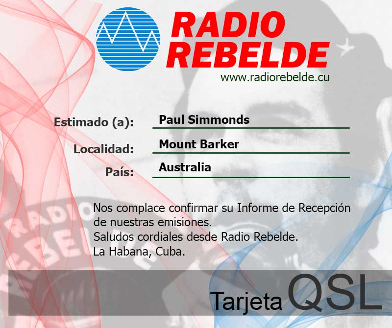 “We are pleased to confirm your Reception Report of our emissions. Best regards Radio Rebelde. La Habana, Cuba”.