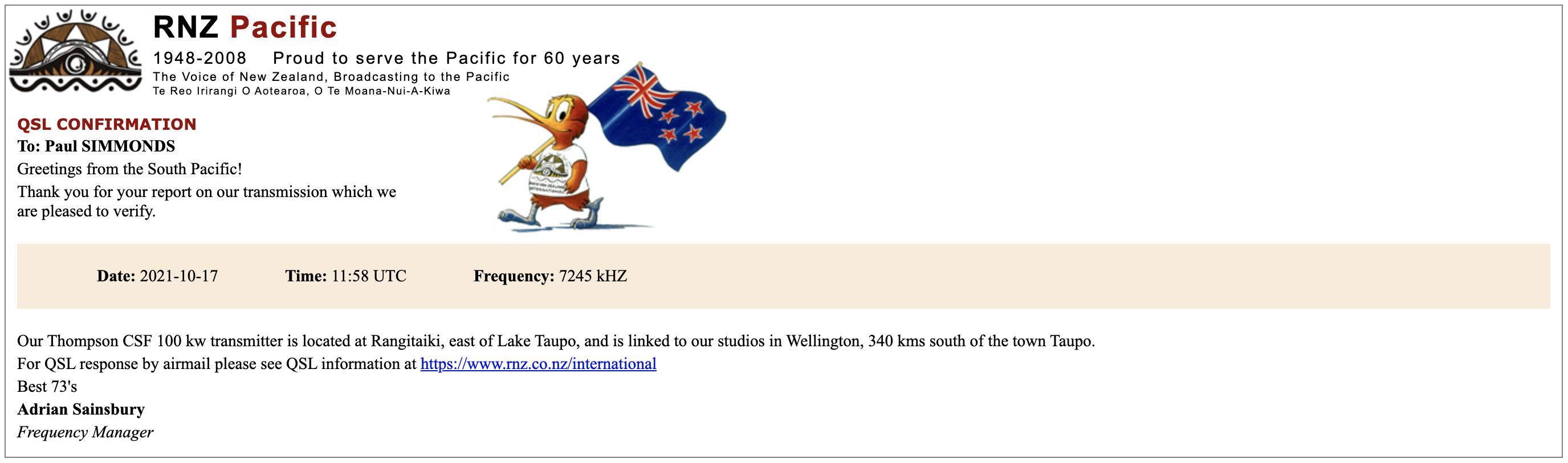 In my email InBox over the past week was an e-QSL from Radio New Zealand re my reception of their station on 17th October 2021.