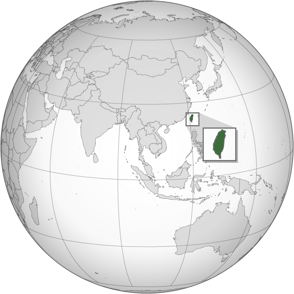 Above:- World globe showing the location of Taiwan. Image c.o Wikipeida