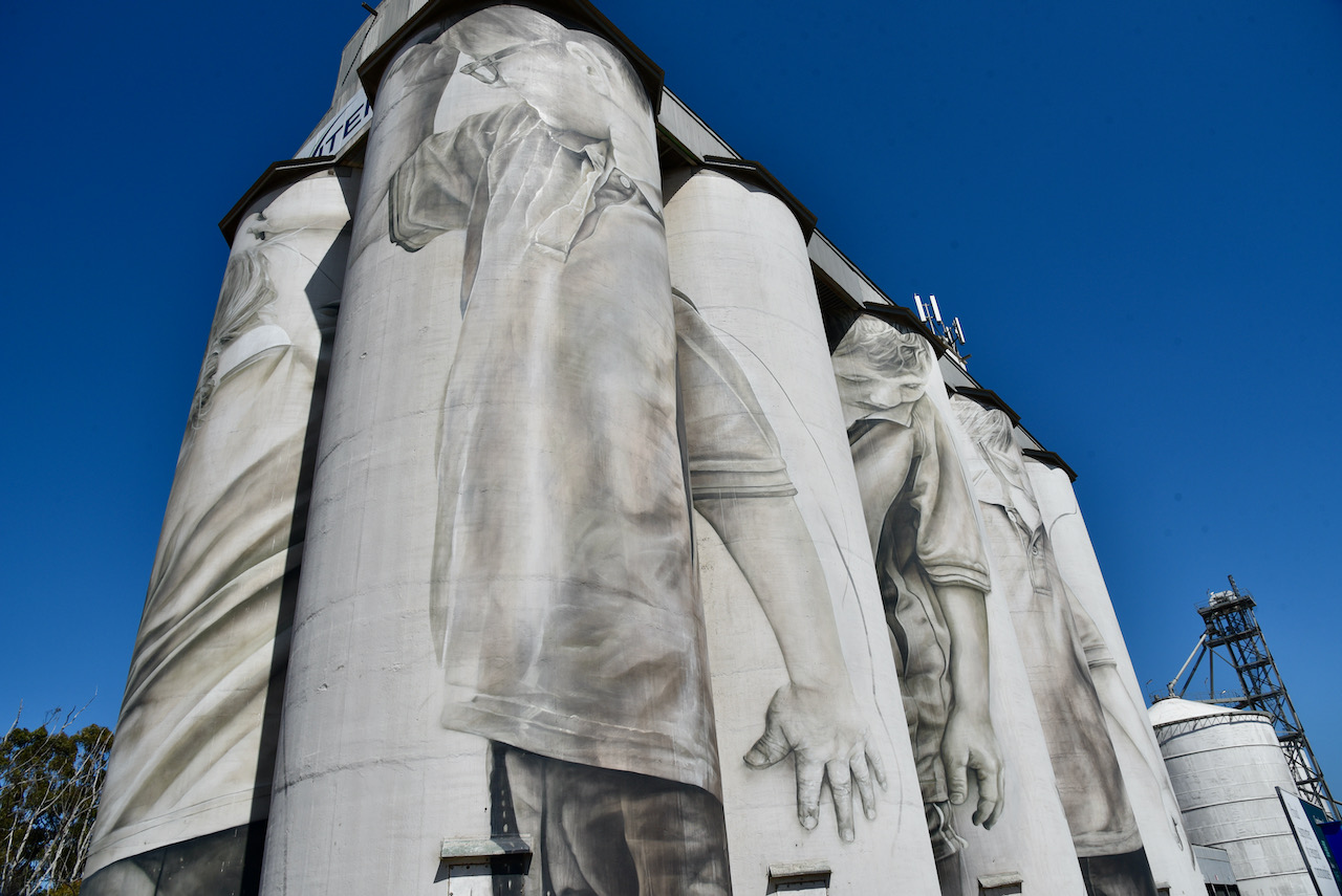 The silo art is the work of world-renowned large scale mural artist Guido van Helten. The murals on the silos depict five Coonalyn primary school children in various poses. The Coonalpyn silos were the first silos to be painted in South Australia and were completed in March 2017. The mural took 200 cans of paint to complete. The artists van Helten used photographs as a reference, and first drew a giant grid onto the face of the five silos. He then sprayed paint to create the designs.