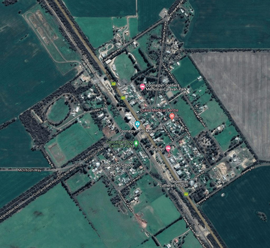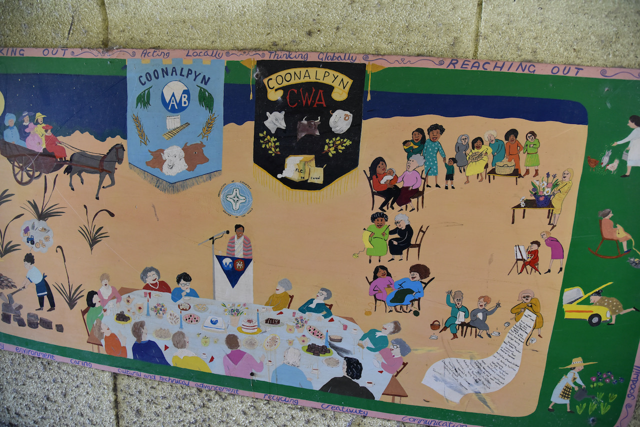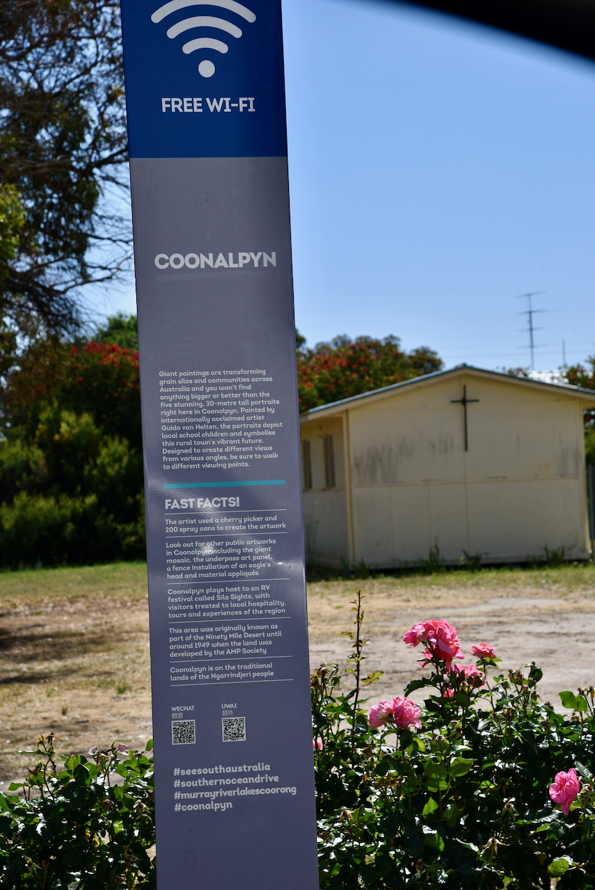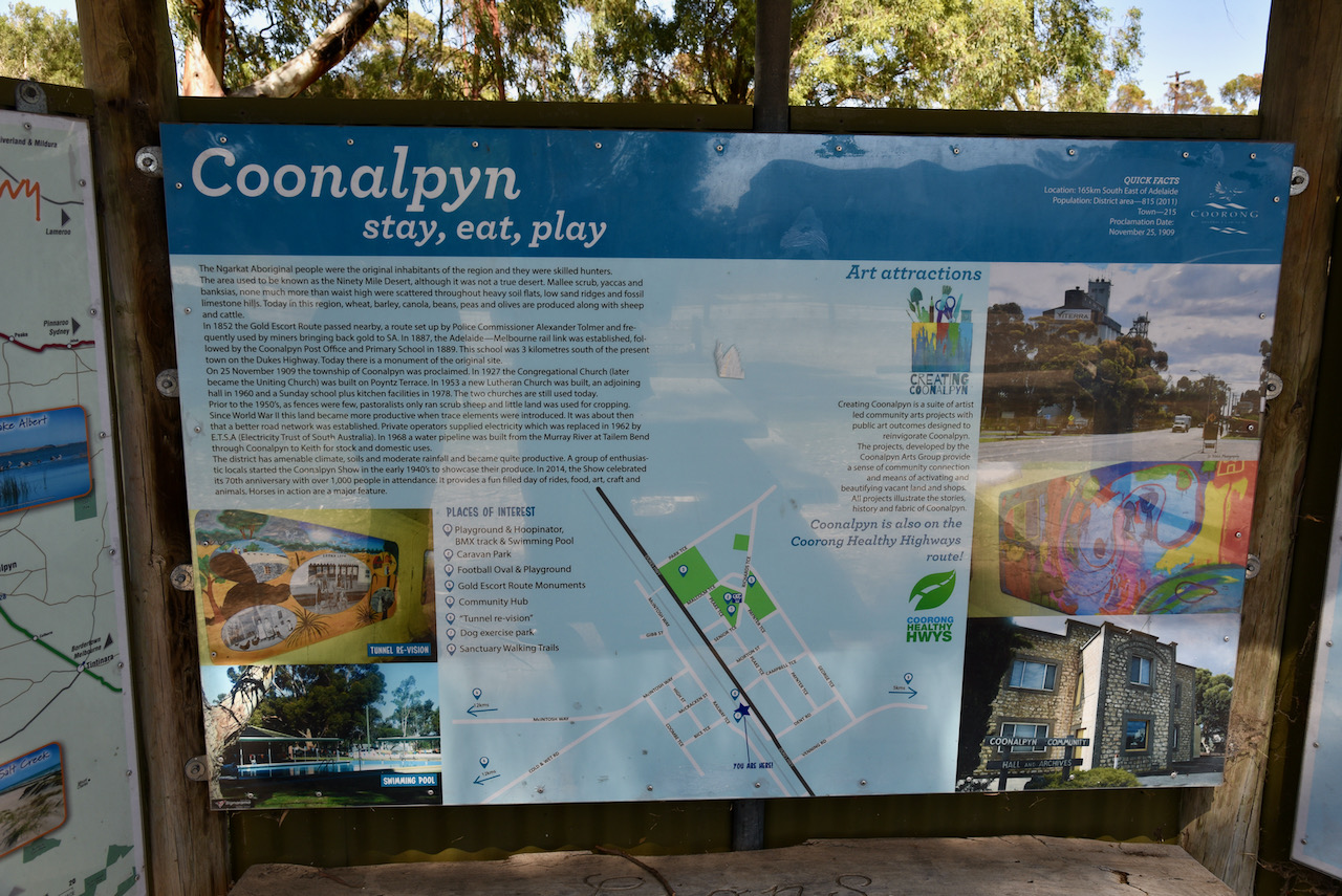 Nowadays in Coonalpyn, you can find a hotel, a community swimming pool, bakery, cafes, the town hall, oval, rest area, school, a medical centre, the silo mural, the Mosiac project, Tunnel Vision, and more.