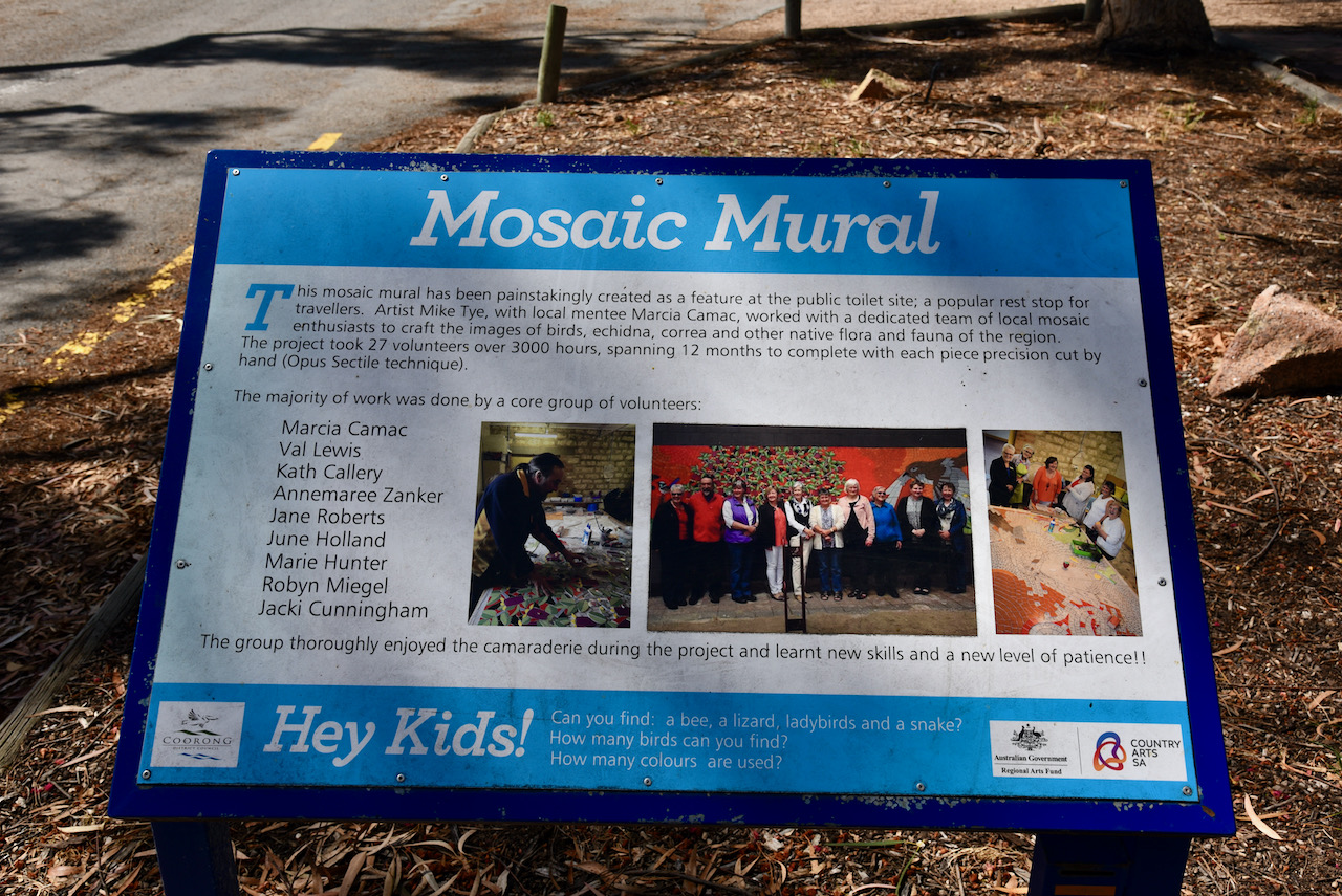 Other than the silo art, you can also view the Mosaic Mural which was created by Mike Tye and Marcia Camac and a team of local mosaic enthusiasts. The mosiac has images of birds, echidna, Correa and other native flora and fauna of the region. It took 27 volunteers over 3,000 hours over a 12 month period to complete.