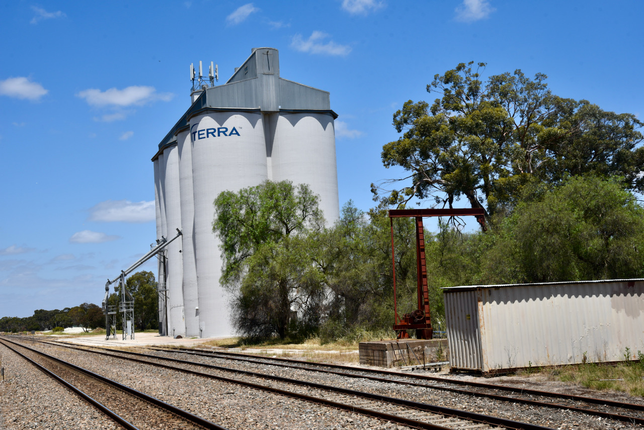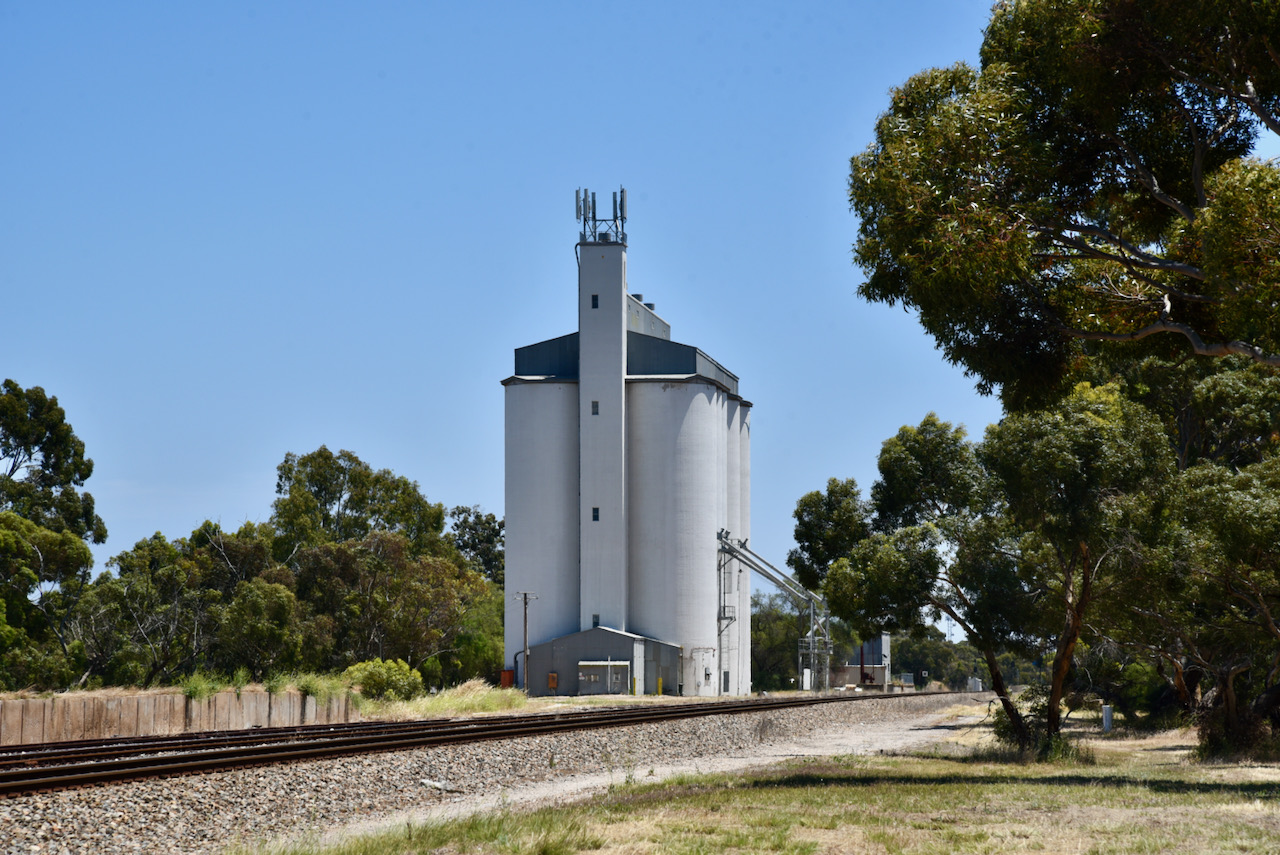 The Tintinara silos are located on the southern side of the Dukes Highway. It was quite noisy in town, so we drove a little further southeast on the Dukes Highway and set up amongst the trees and alongside of the highway and the railway line.