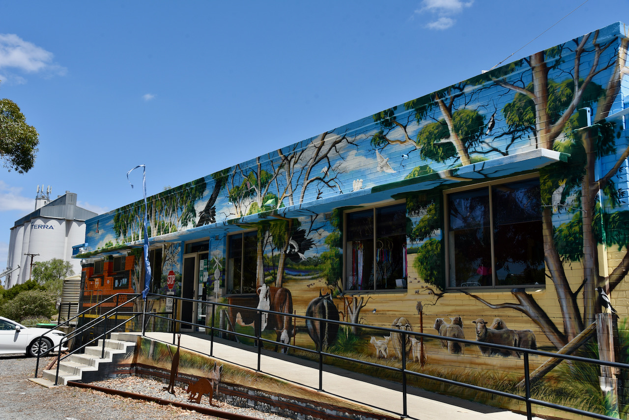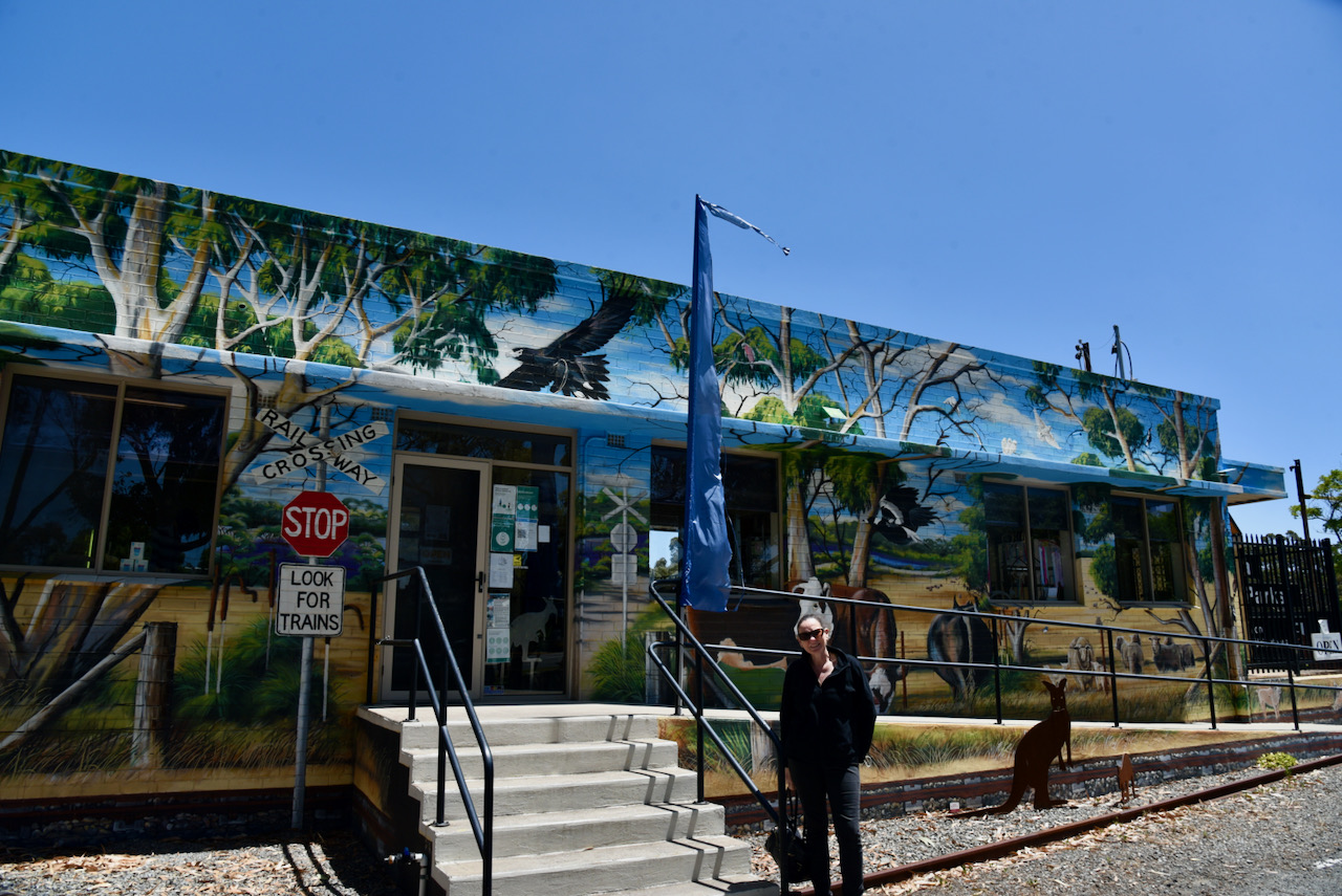 After packing up at the silo we headed to the Tintinara Visitor Information Centre which has a very distinctive mural painted on it that features a train, and the beef, sheep and wool industries of the district.