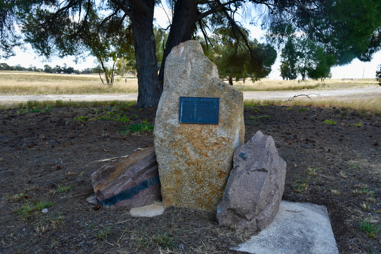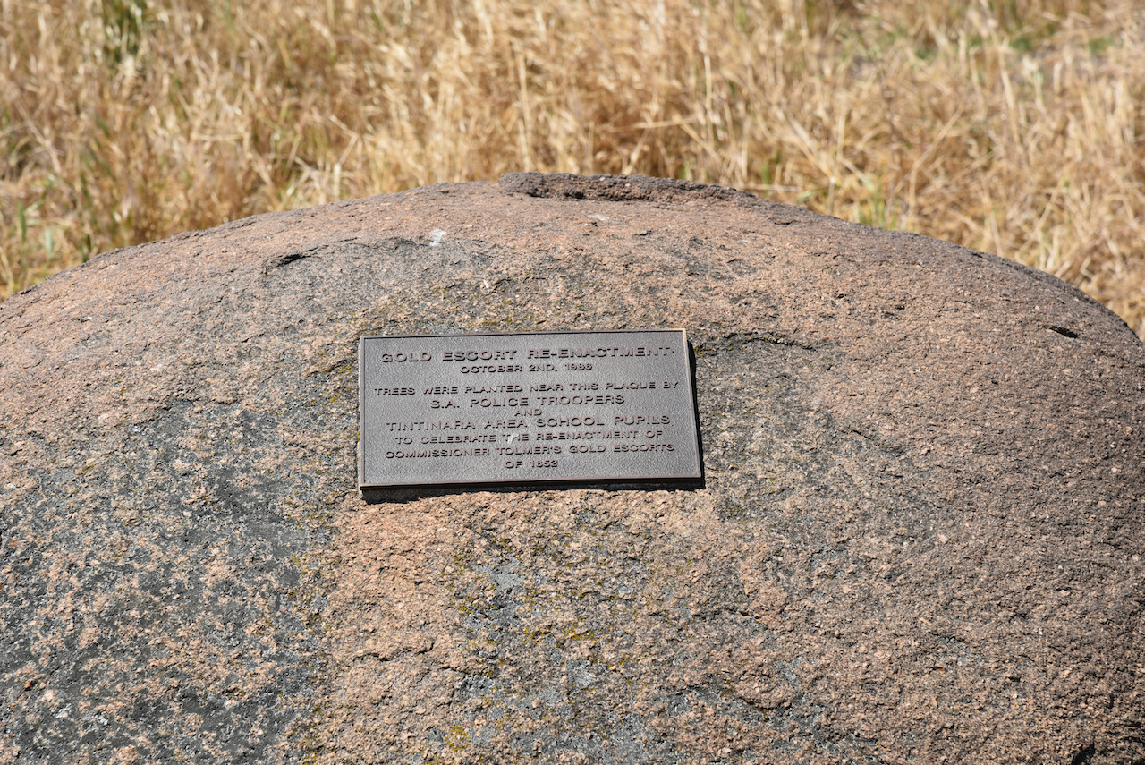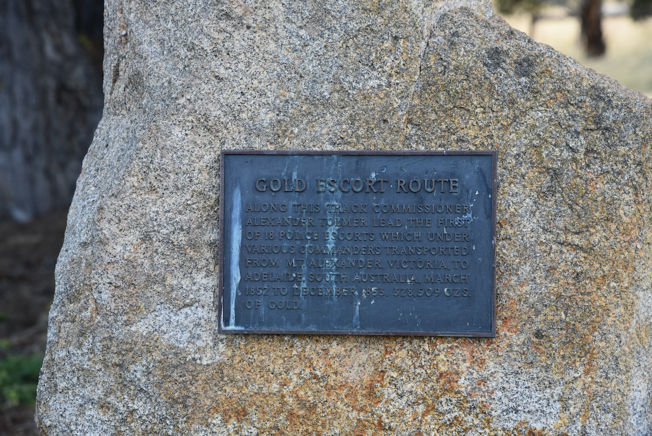 “Along this track Commissioner Alexander Tolmer lead the first of 18 police escorts which under various commanders transported from Mt Alexander Victoria to Adelaide, South Australia, March 1852 to December 1853, 328,509 ozs of gold”