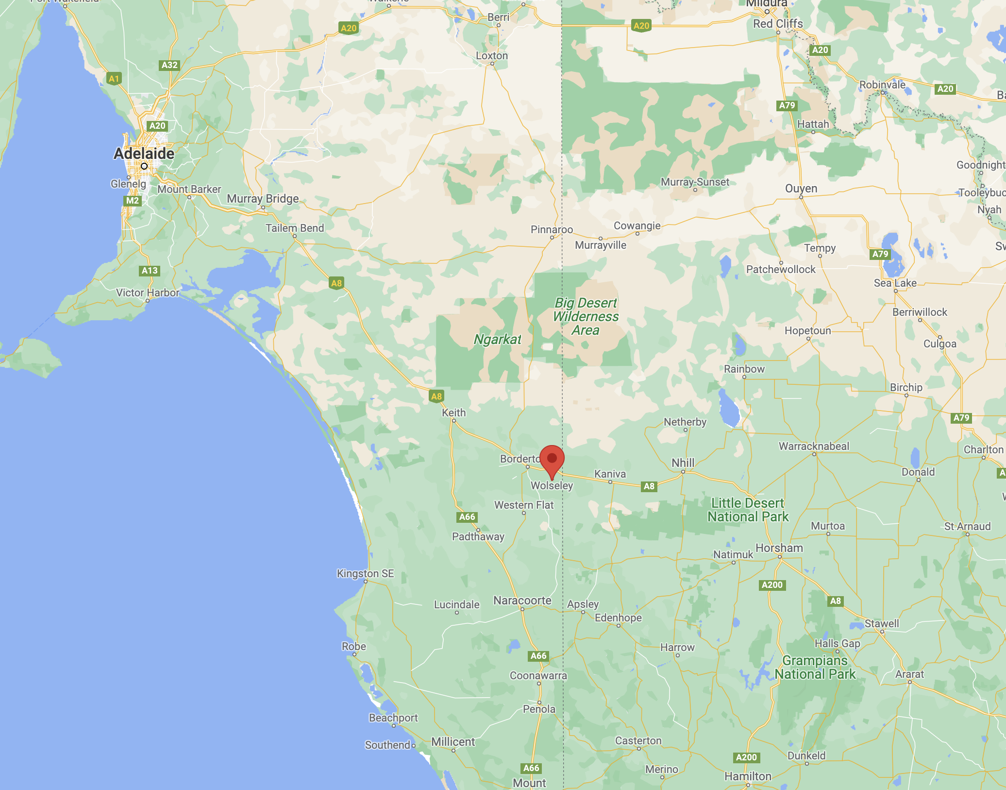 The Wolseley Conservation Park is about 24 hectares (59 acres) in size and was established on the 29th day of November 2001. It was established to protect the nationally threatened Buloke Woodland which is one the last remaining in South Australia.