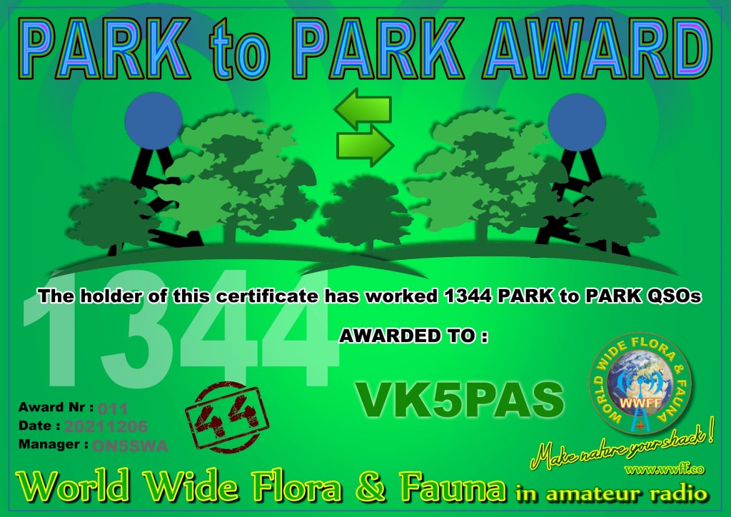 In the past week, I received my latest World Wide Flora Fauna (WWFF) Park to Park award, issued for having made 1,344 Park to Park contacts.