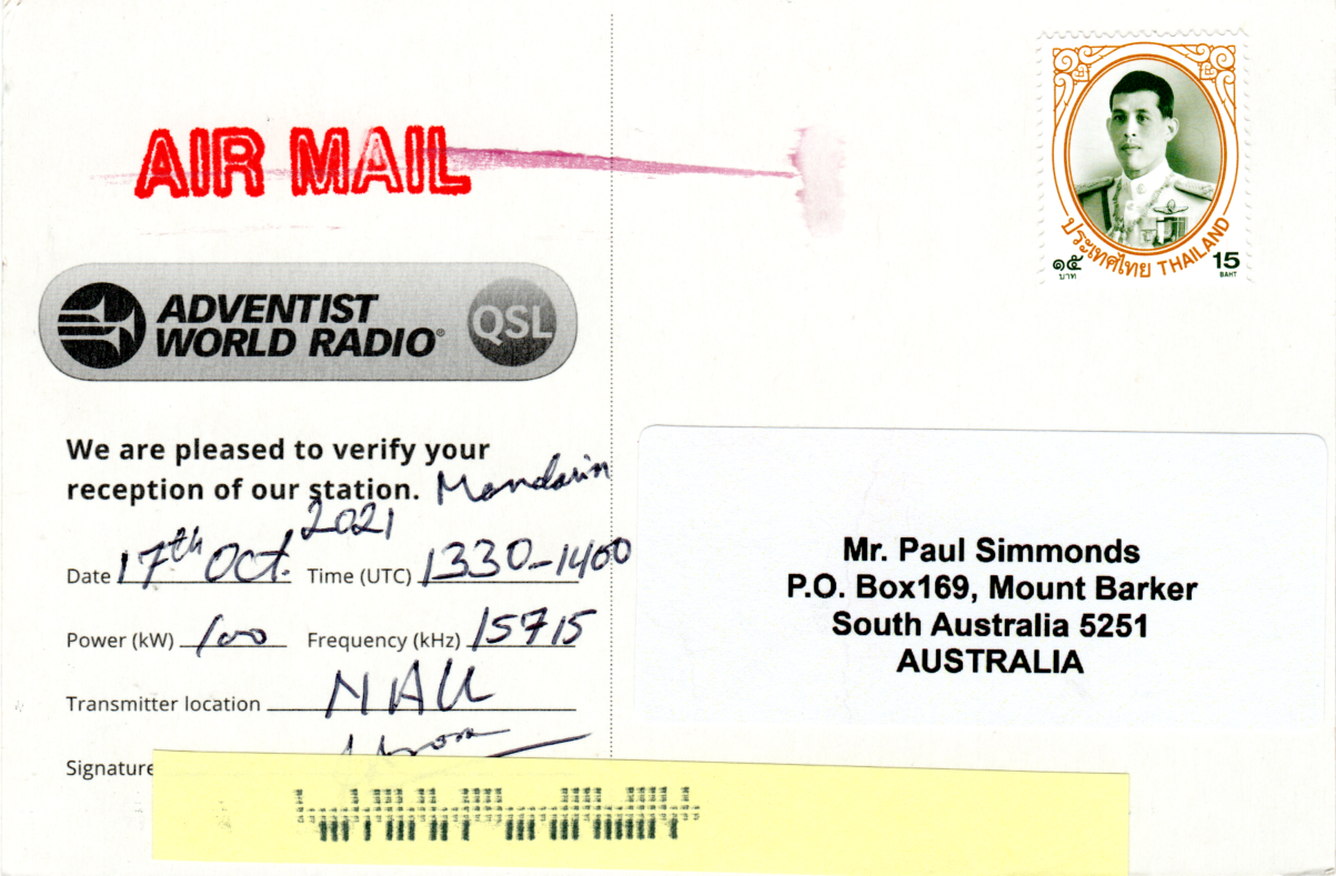 About a week ago I received a QSL card from Adventist World Radio – The Voice of Hope. I tuned in to the Voice of Hope on 17th October 2021 on 15715 kHz.