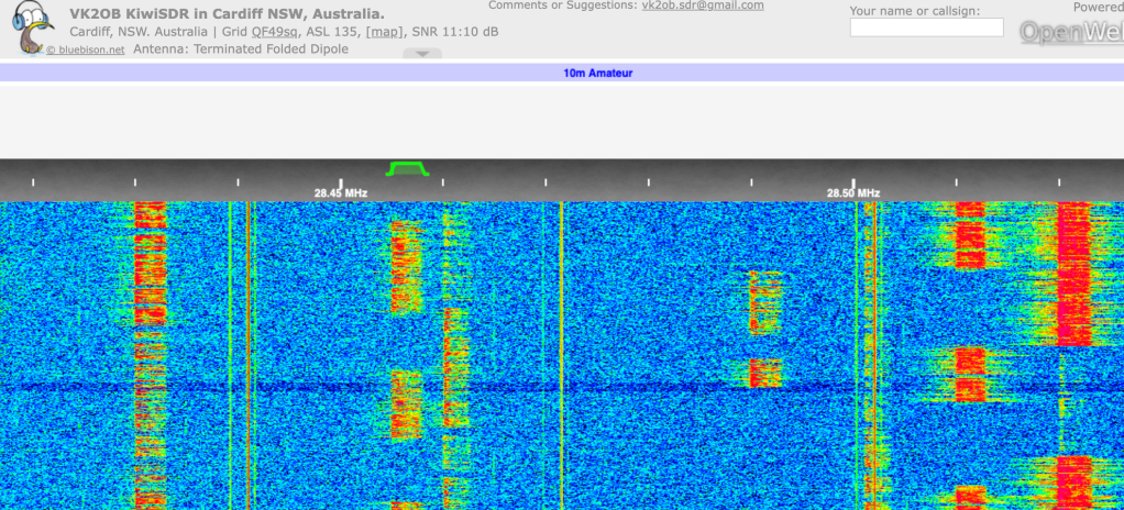 The 10m band was absolutely humming with lots of activity. I worked a total of 56 stations on 10m. You can see below from the waterfall on the VK2OB kiwisdr that 10m was busy.