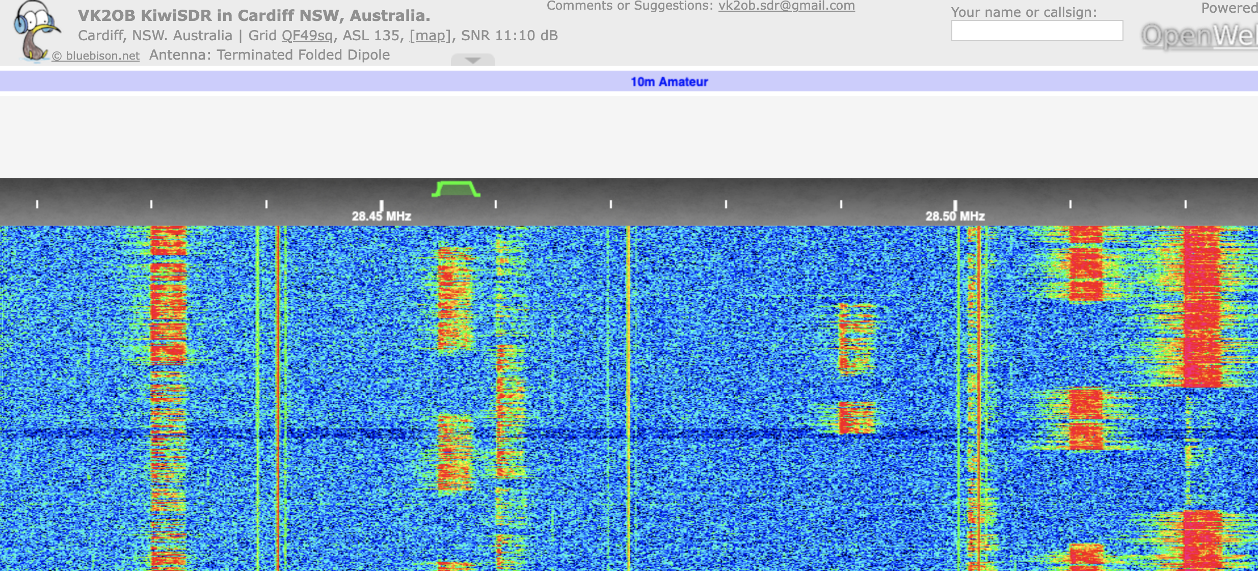 The 10m band was absolutely humming with lots of activity. I worked a total of 56 stations on 10m. You can see below from the waterfall on the VK2OB kiwisdr that 10m was busy.