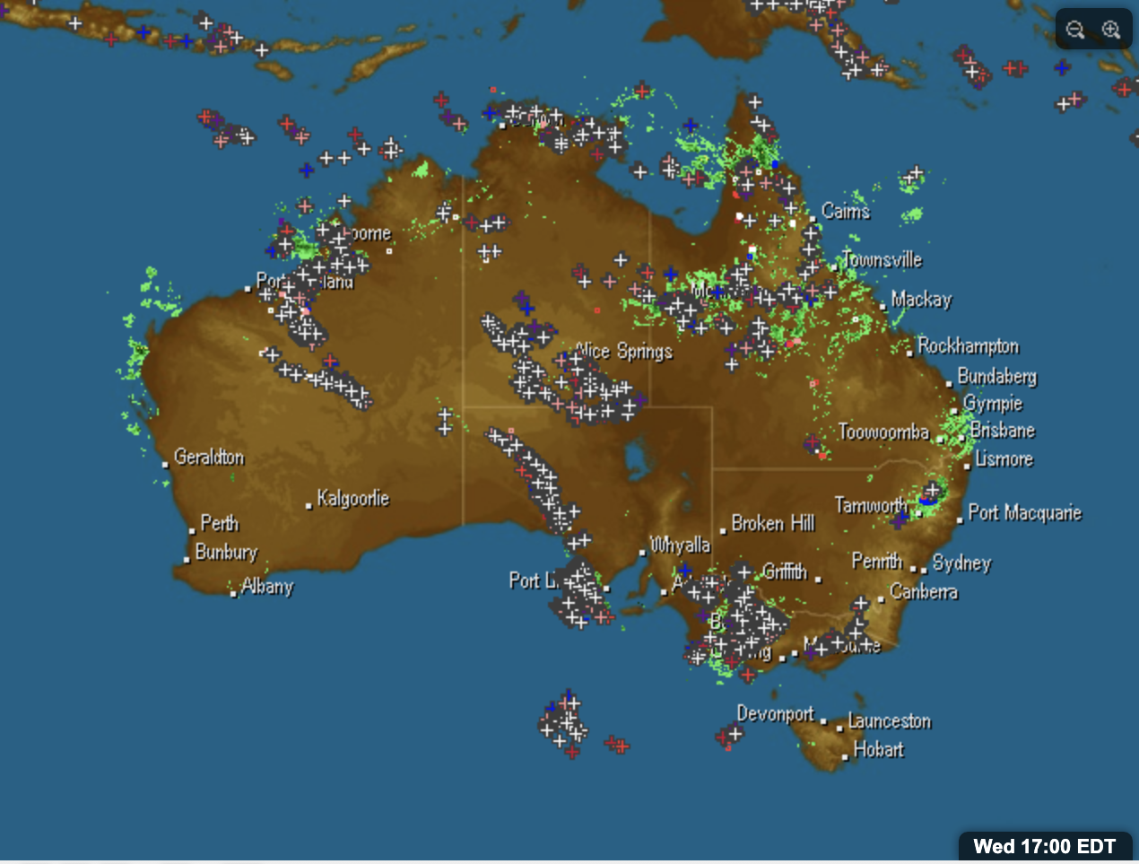 Unfortunately by the evening, the static crashes had become strength 9 and plus at times due to all of the storms around Australia. It made it extremely difficult to hear the lower down stations on 40m. The map below shows all of the lightning activity and explains why it was so noisy. The 80m band was unusable due to the noise.
