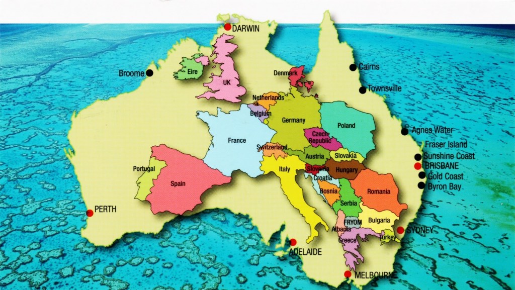 Australia is a big country. It is about 4,000 km east to west and about 3,200 km south to north. The whole of Europe and the United Kingdom easily fits inside Australia, as the map below shows.