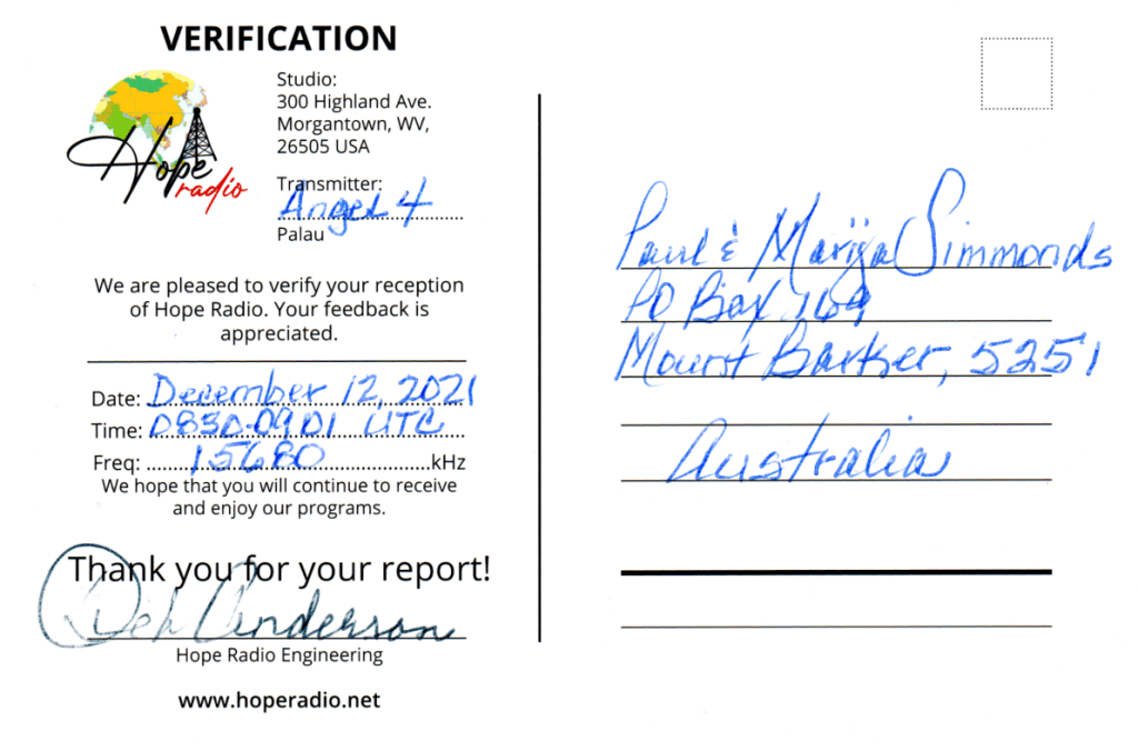 Yesterday in the mail I received a QSL card from Hope Radio Palau regarding my reception of their station on 12th December 2021.