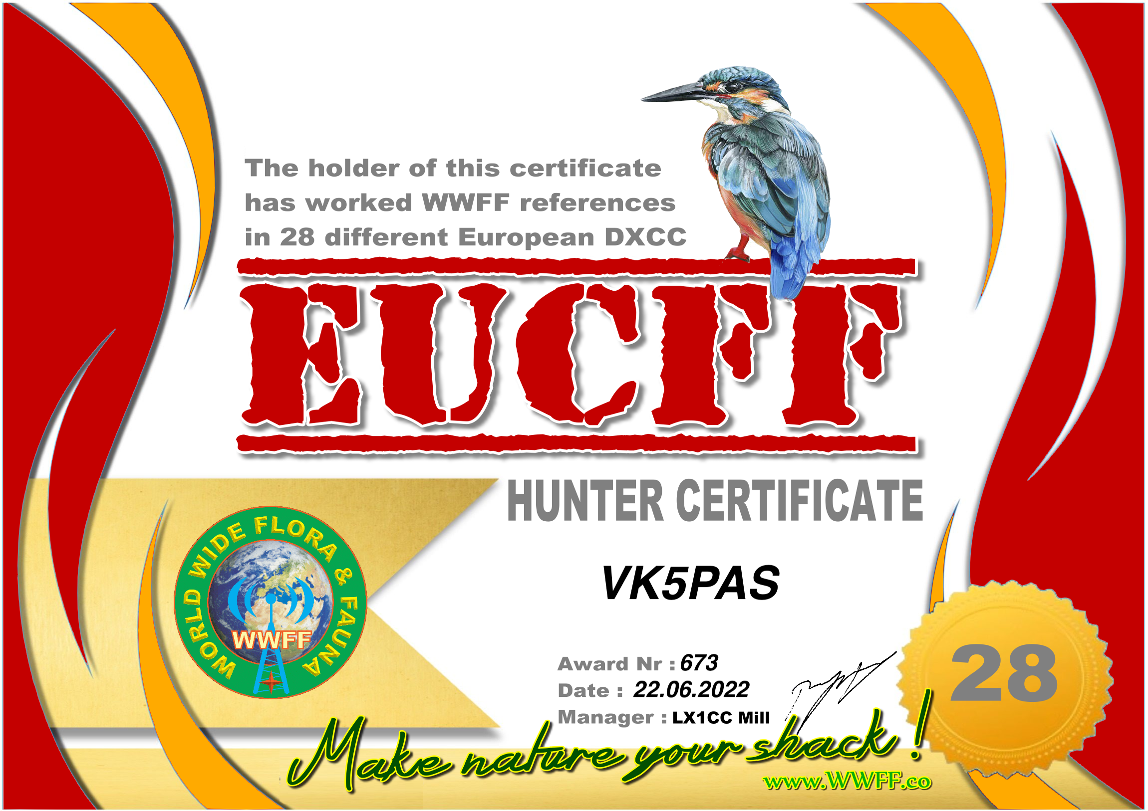Issued for having worked WWFF references in 28 different European DXCC.