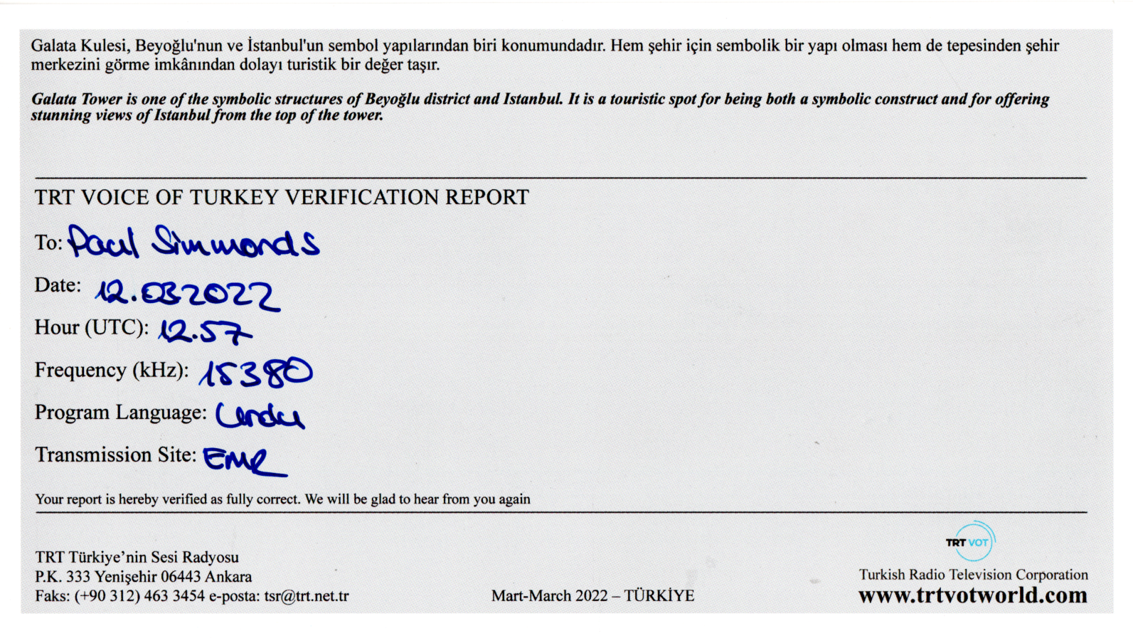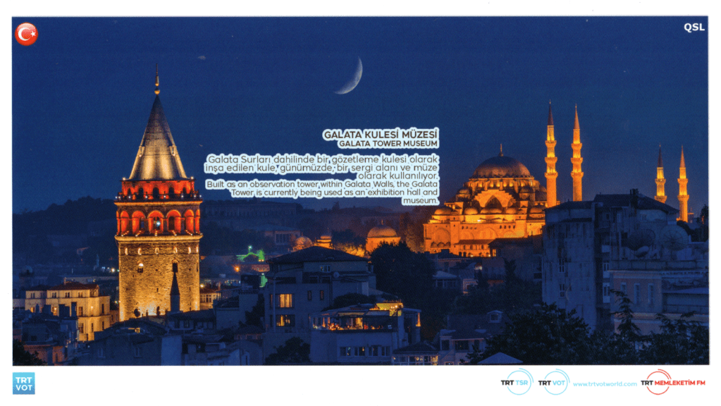 Received in yesterday’s mail, a QSL card from the Voice of Turkey, for my reception of their station in March 2022.