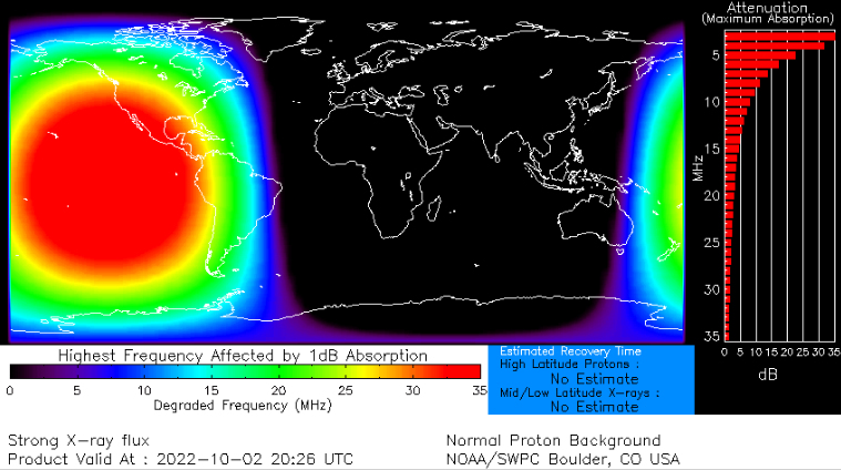 The band conditions on Saturday were excellent. I made a total of 856 QSOs from 0600 UTC Saturday to 0000 UTC Sunday. This was 84% of my contacts over the 24 hour period. A significant X-1 class solar flare from sunspot AR3100 caused a significant shortwave radio blackout over the Pacific Ocean. The picture below shows the blackout map over the Pacific Ocean and parts of North America.