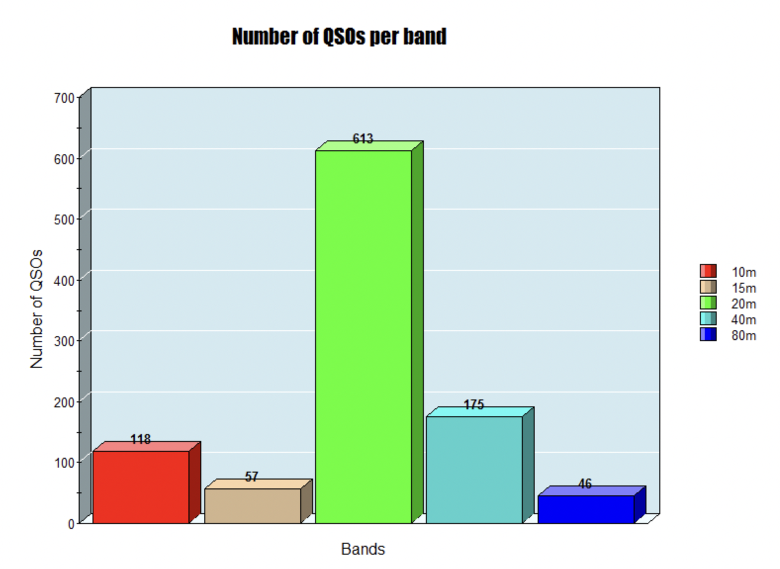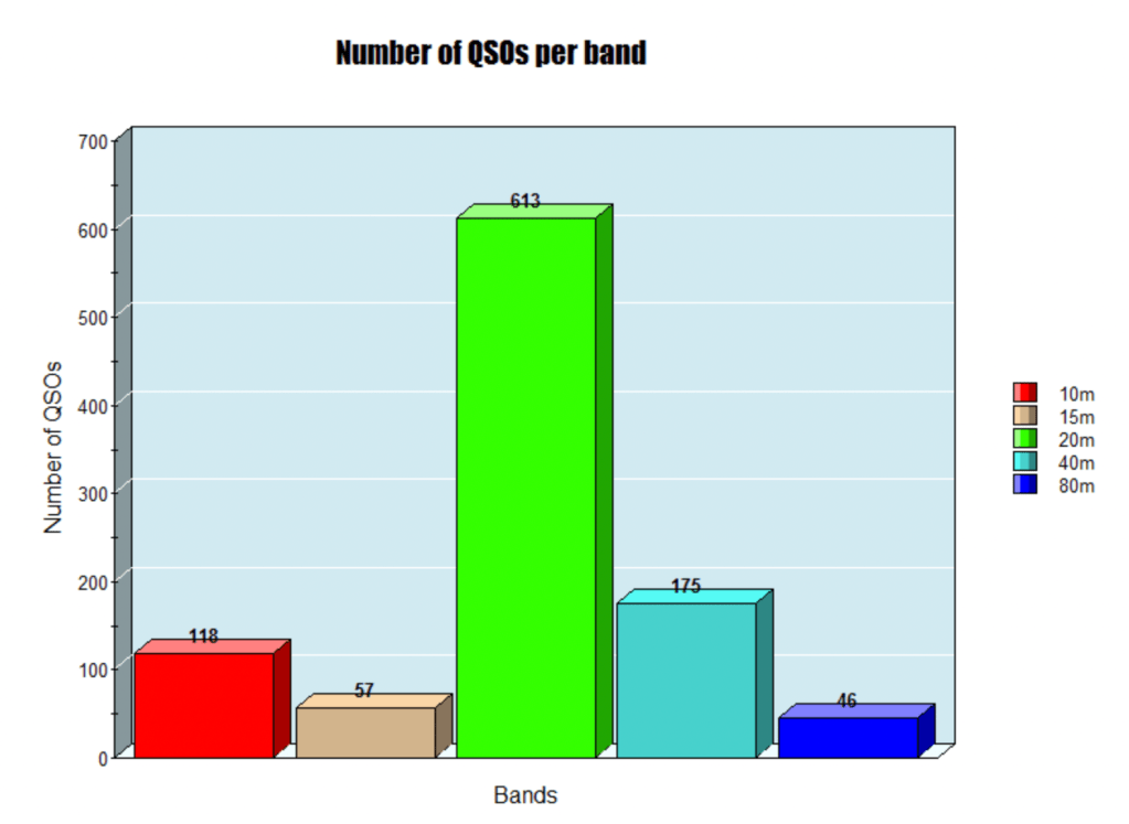 The majority of my contacts were on the 20m band. I made a total of 613 QSOs on that band. This was about 60% of my QSOs.