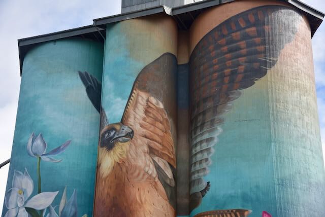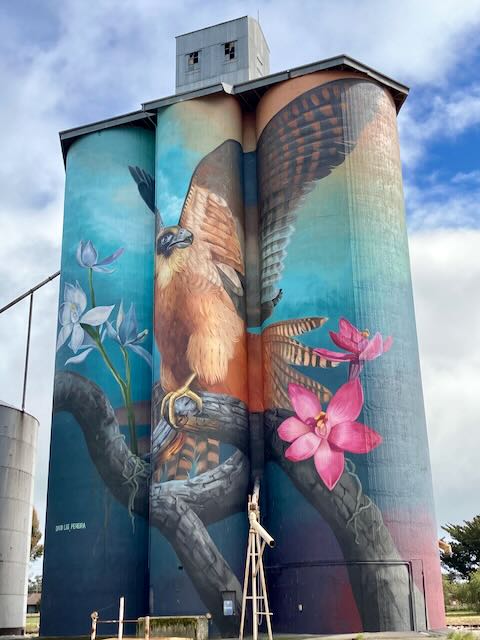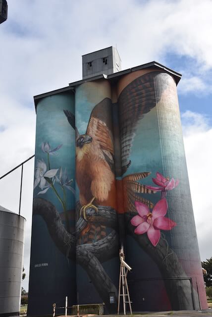 The design on the Kaniva 2 silo features the Australian Hobby, a raptor. The silo also has a Plains sun orchid and a salmon/pink sun orchid. The silo art design at Kaniva is a tribute to native flora and fauna found in the nearby Little Desert National Park.