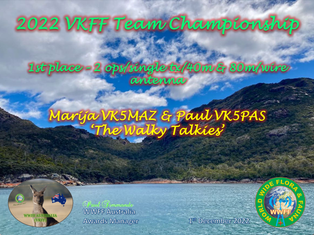 Marija VK5MAZ and I took part in the 2022 VKFF Team Championship. We entered into the 2 ops/single tx/40m & 80m/wire antenna category. In fact we were the only entrants in that category of all nine teams that entered.