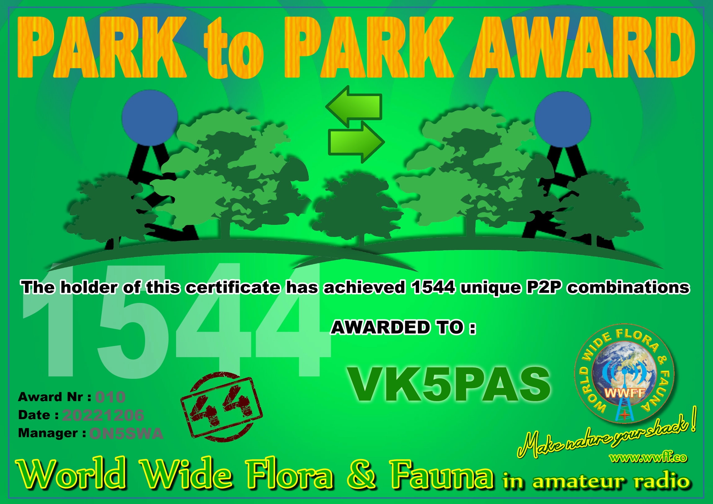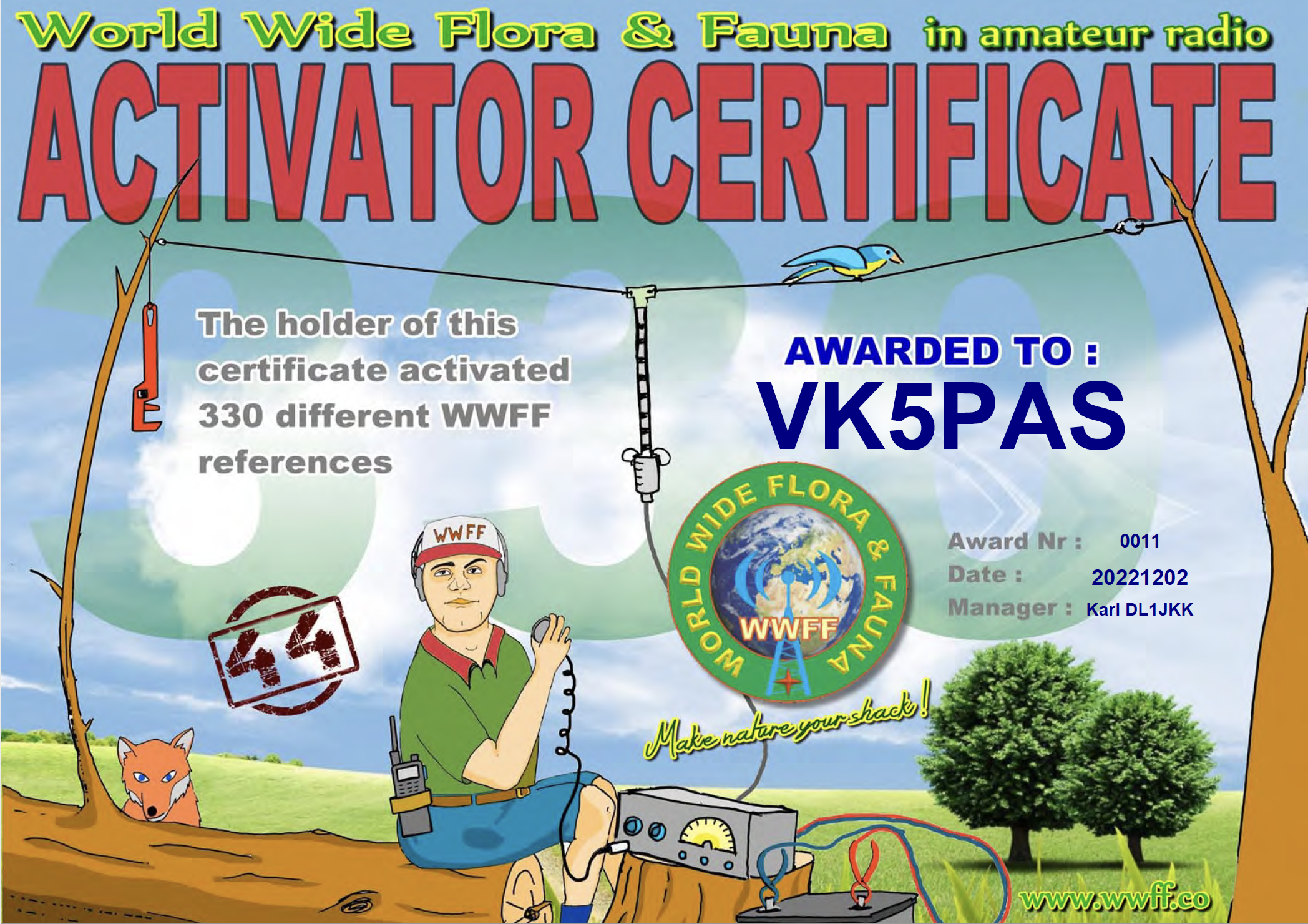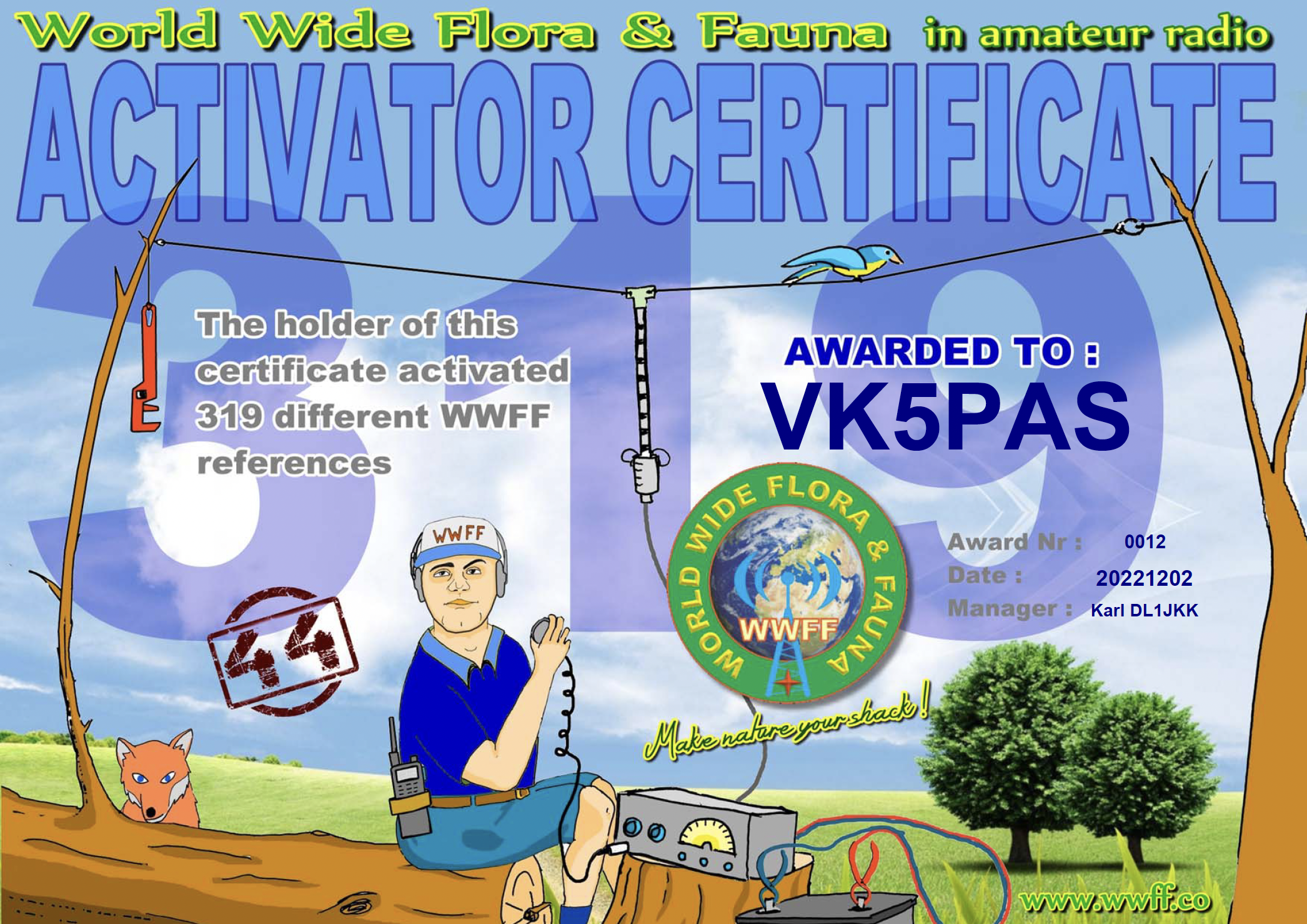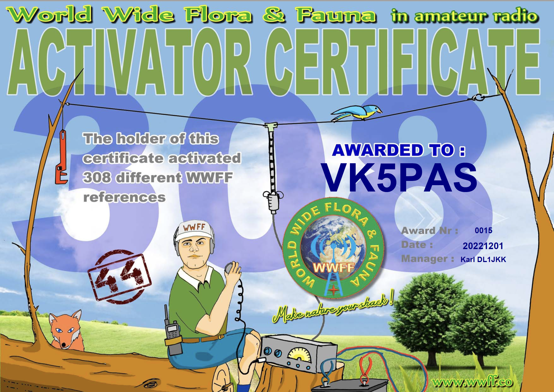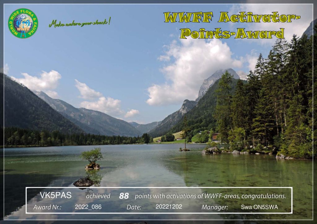 Thanks to all of the WWFF Hunters and thanks to the Awards Manager Karl DL1JKK.