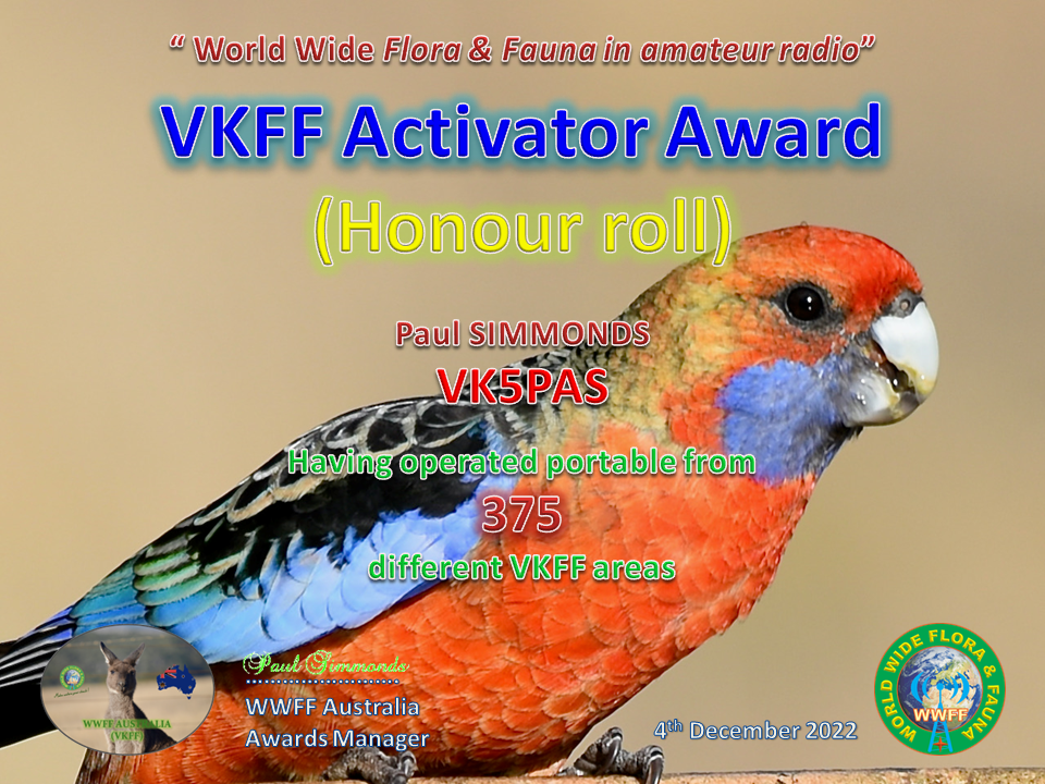 Following my recent trip to VK6, VK7 and VK3, I qualified for my latest Activator award for the World Wide Flora Fauna (WWFF) program. It is the VKFF Activator Honour Roll 375, issued for having activated a total of 375 different VKFF reference areas.
