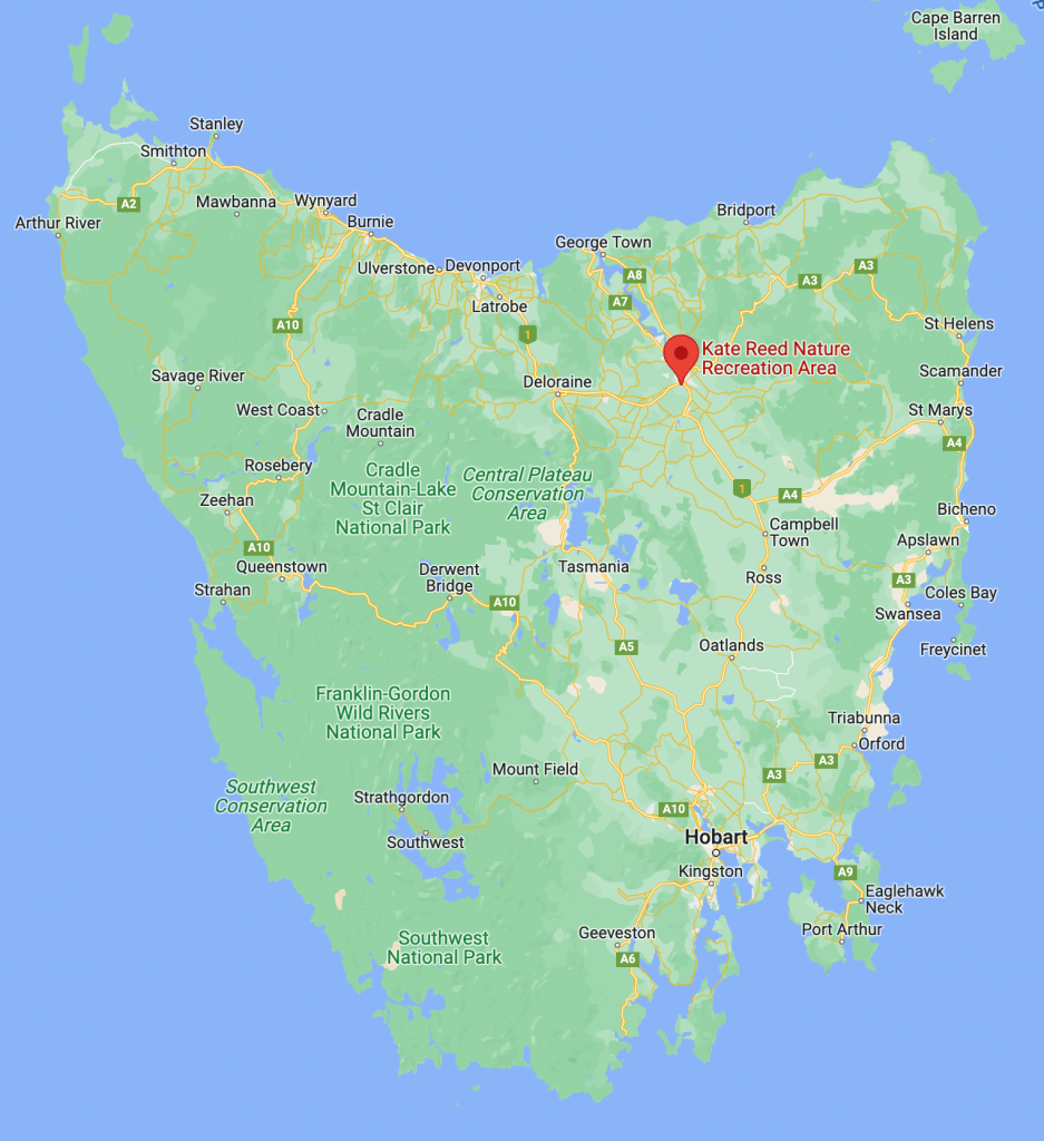 Above:- Map of Tasmania showing the location of the Kate Reed Nature Recreation Area. Map c/o Google maps