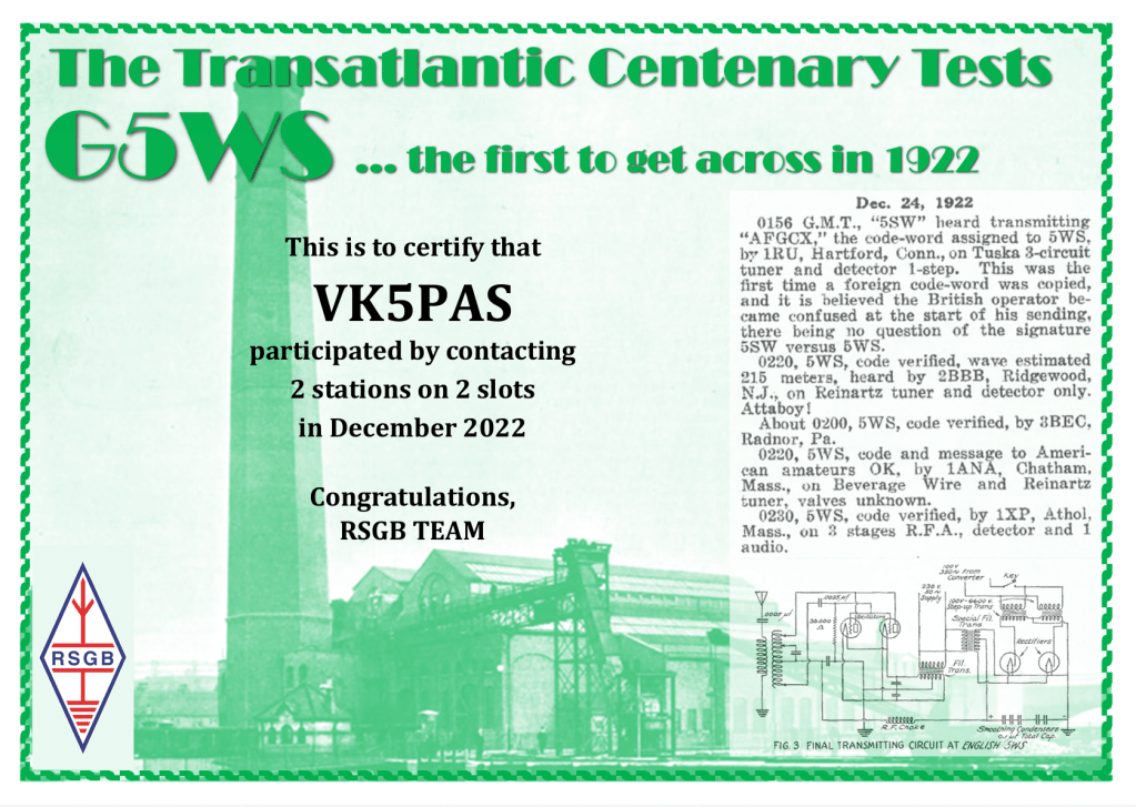 Received the following certificate for working at least 2 of the special Transatlantic Centenary stations.