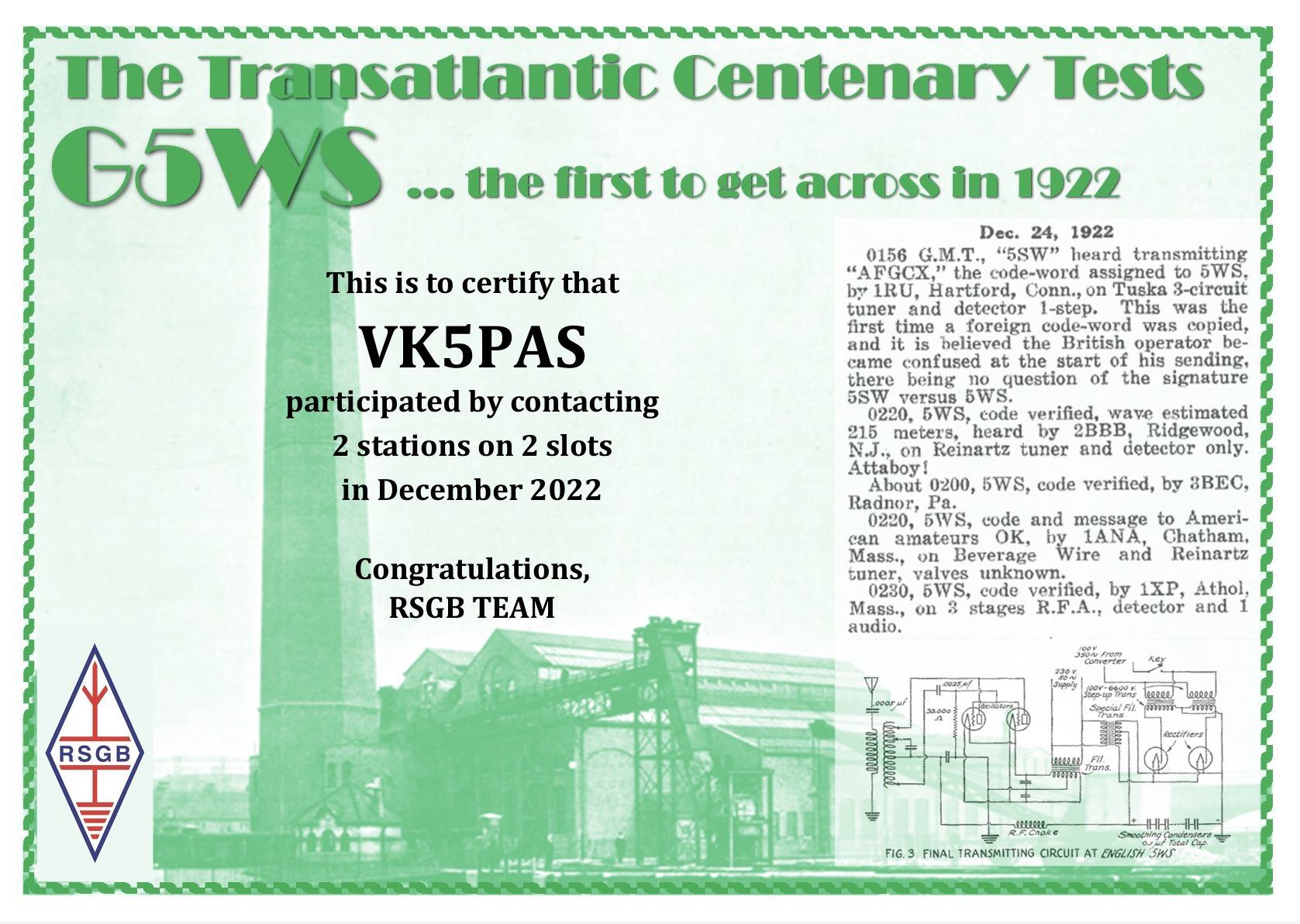 Received the following certificate for working at least 2 of the special Transatlantic Centenary stations.