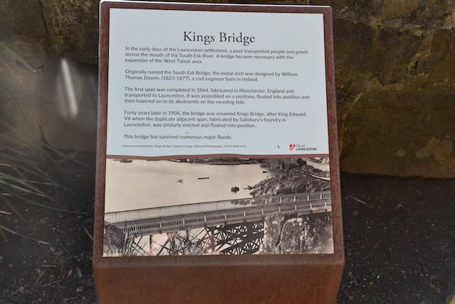 The first span of the Kings Bridge was completed in 1864. It was originally named the South Esk Bridge and was designed by William Thomas Doyne, a civil engineer from Ireland. The first span was fabricated in Manchester and was transported to Launceston where it was assembled on a pontoon and then floated into position and the lowered on to its abutments on the receding tide. In 1904 the bridge was renamed Kings Bridge in honour of King Edward VII.
