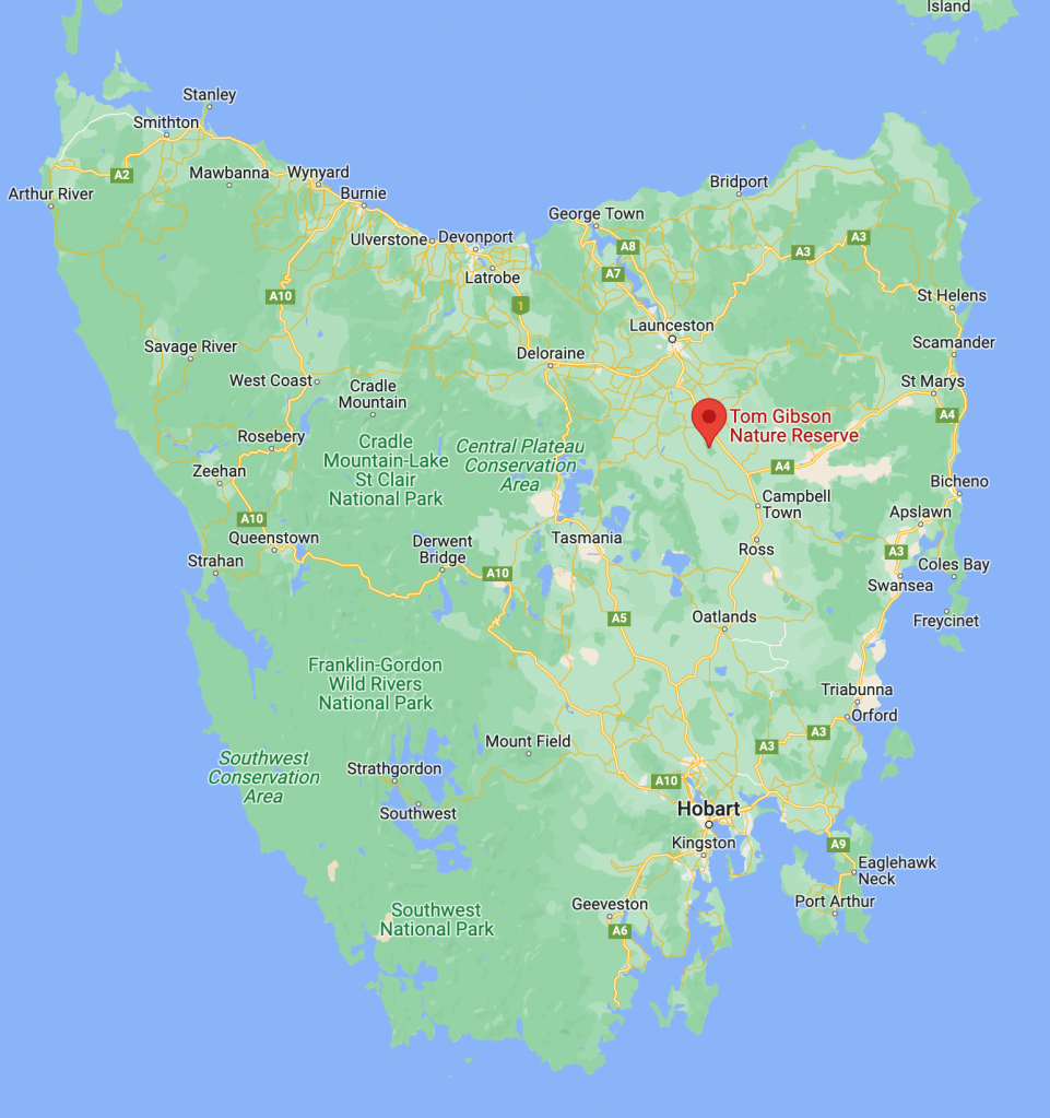 Above:- Map of Tasmania showing the location of the Tom Gibson Nature Reserve. Map c/o Google maps.