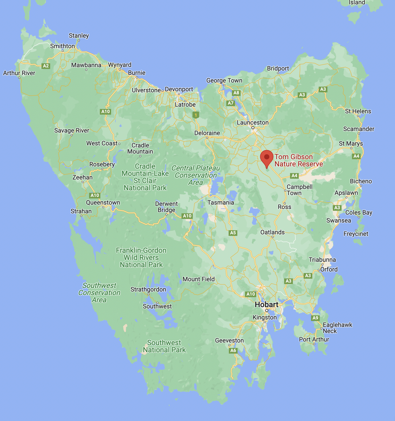 Above:- Map of Tasmania showing the location of the Tom Gibson Nature Reserve. Map c/o Google maps.
