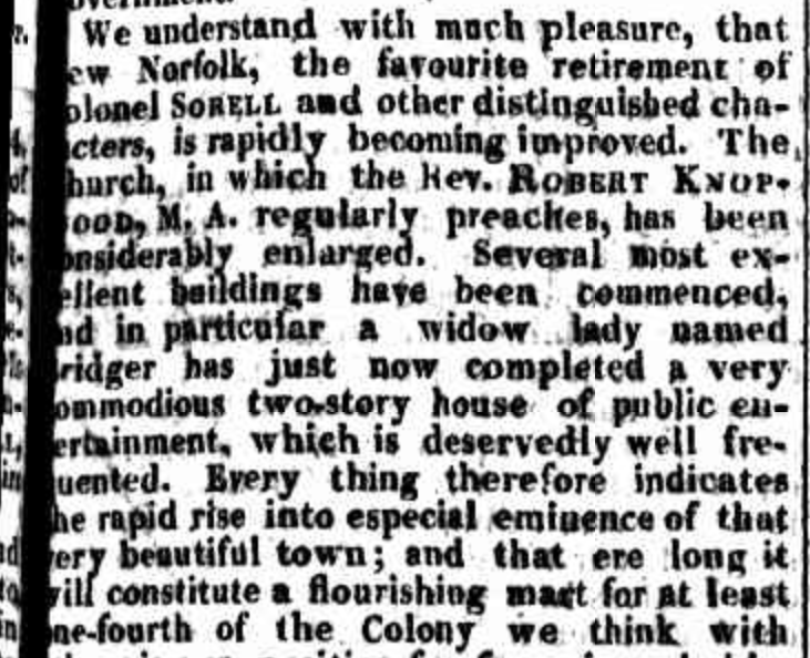Glen Clyde House was built in 1840 by convicts, originally as a private home. It was licenced as the ‘Tasmanian Lass’ in 1844. James Jacksons Emporium was built in 1854. The foundation stone for St Peters church was laid in 1834. The church was completed in 1837. The church had only one door and this was due to the fact that 50% of the congregation were convicts and the single door made escape more difficult.