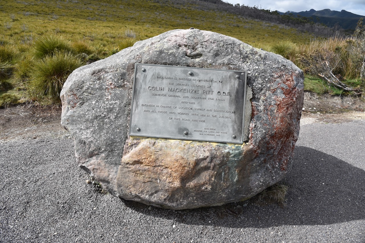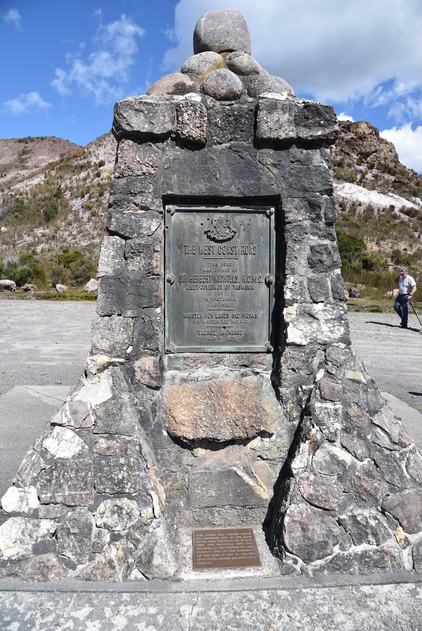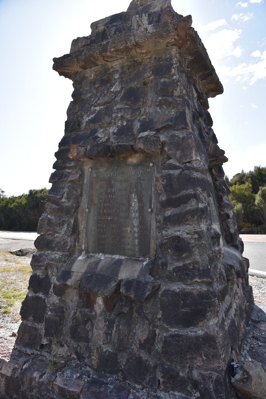 We headed north out of Queenstown on the Lyell Highway and stopped briefly at the junction of the Lyell Highway and the Zeehan Highway where there is a monument for the opening of the Queenstown-Strahan Road. Work commenced on the road on the 18th day of March 1935 and it was opened on the 30th day of October 1937.