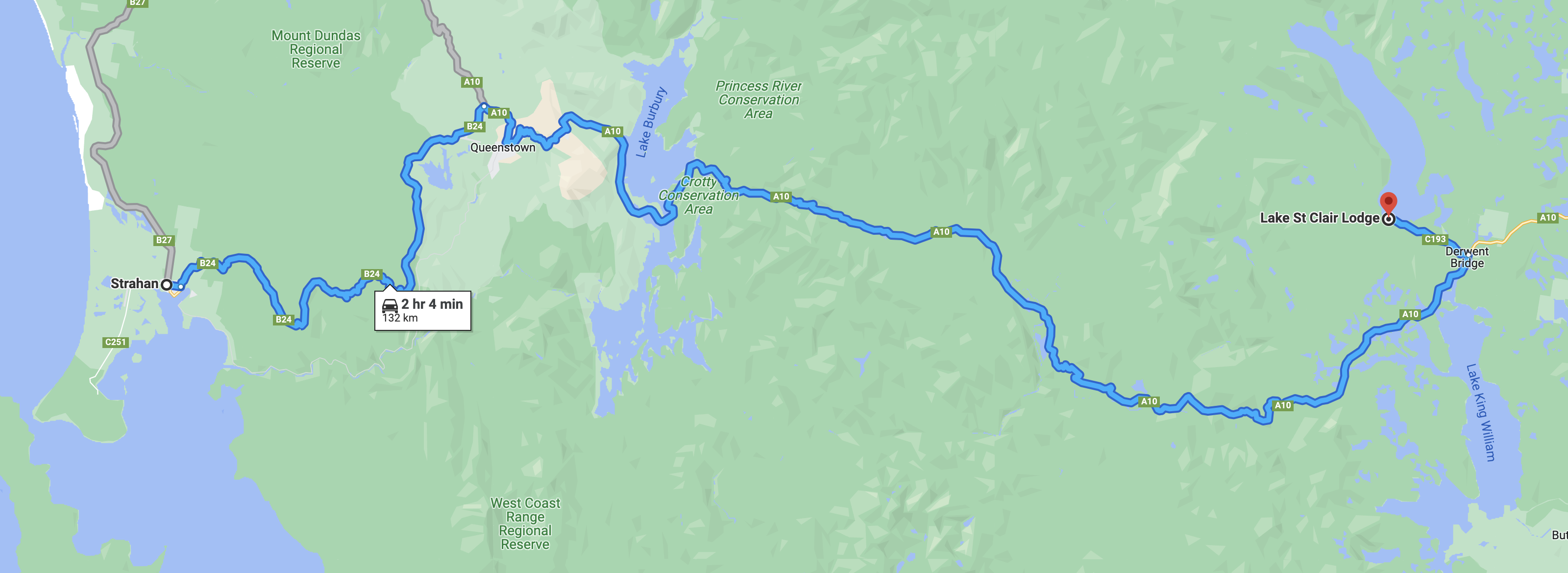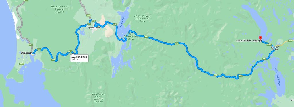 Above:- Map showing our route from Lake St Clair to Strahan. Map c/o Google maps.