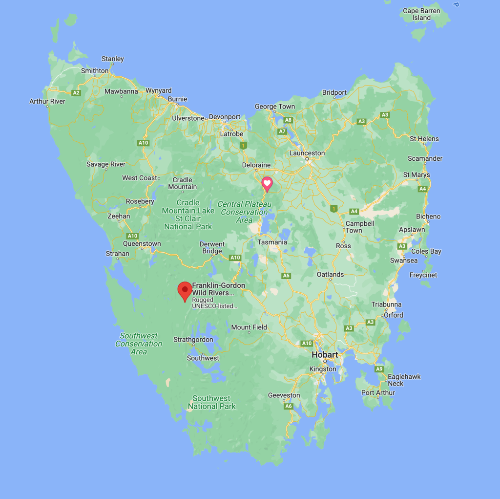 Above:- Map of Tasmania showing the location of the Franklin Gordon Wild Rivers National Park. Map c/o Google maps.