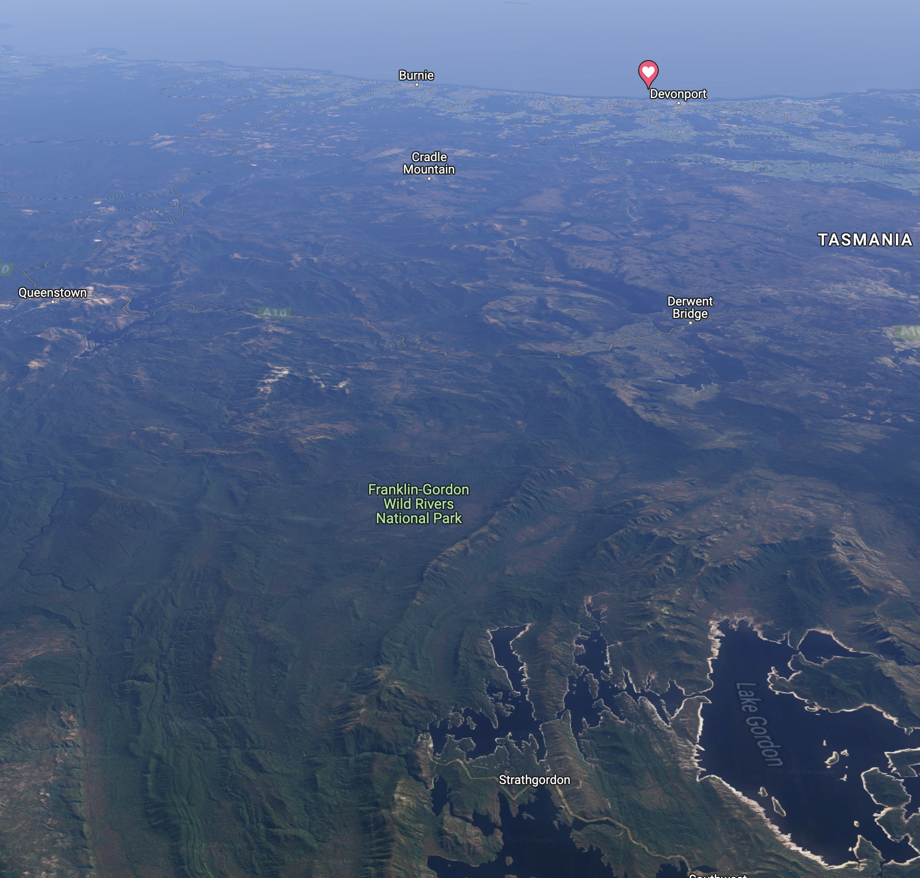 Above:- An aerial view of the Franklin Gordon Wild Rivers National Park. Image c/o Google maps