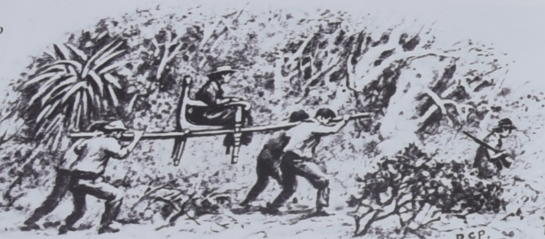 Prior to the construction of the Highway, access to the west coast of Tasmania was along rough tracks. This included a track which was cut in 1840 for Governor Sir John Franklin to travel overland to MacQuarie Harbour. His wife Lady Jane Franklin accompanied him on the inaugural journey which took 20 days with Lady Jane being carried part way by convicts on a purpose built Blackwood chair.
