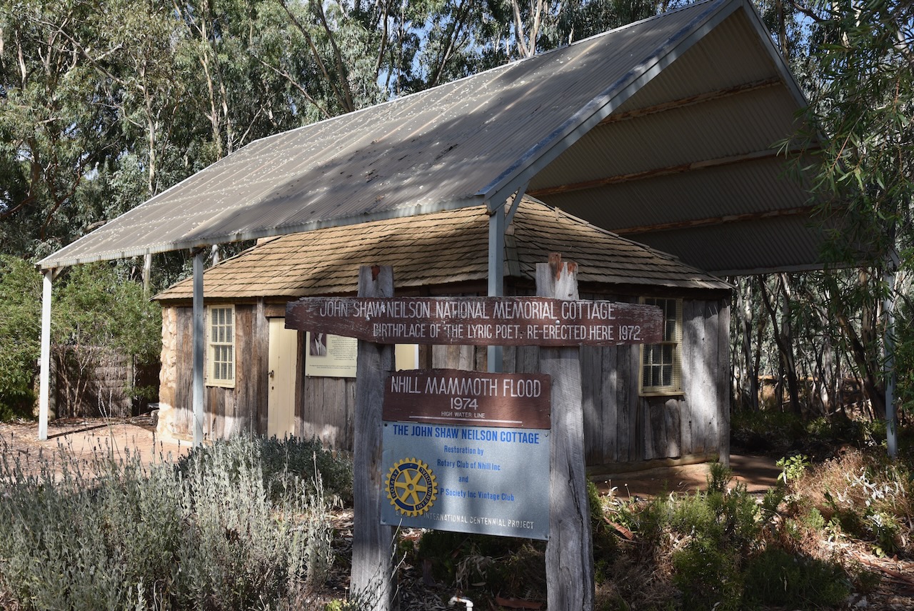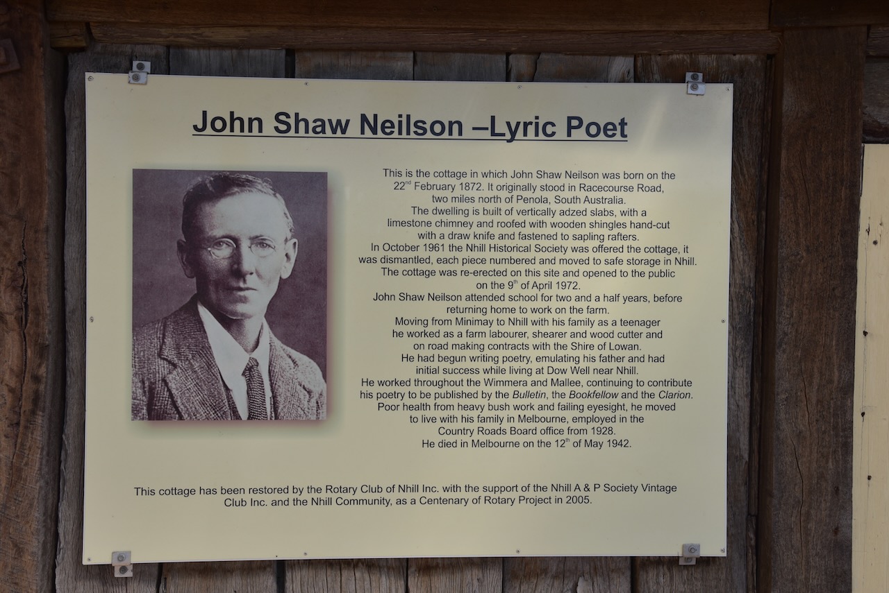 Nhill is the birthplace of one of Australia’s most admired Lyric Poet, John Shaw Neilson. His cottage in which he was born on the 22nd day of February 1872, can be found in the town. It was originally located on Racecourse Road but was relocated and restored by the Rotary Club of Nhill. In October 1961 the cottage was offered to the Nhill Historical Society and it was dismantled, with each piece being numbered and then moved to safe storage in Nhill. It was then re-erected and opened to the public on the 9th day of April 1972. It can be found at the Nhill Jaypex Public Park on the Western Highway.