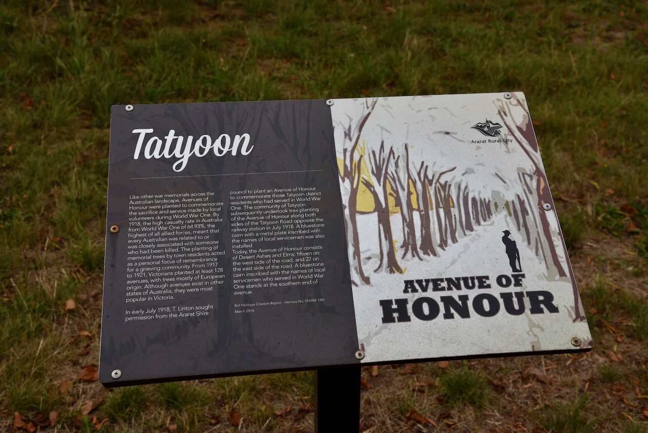 Nowadays, Tatyoon is a small settlement with a rural supplies store, an old church, and an oval. There is also an Avenue of Honour to honour those from Tatyoon who served in the First World War.