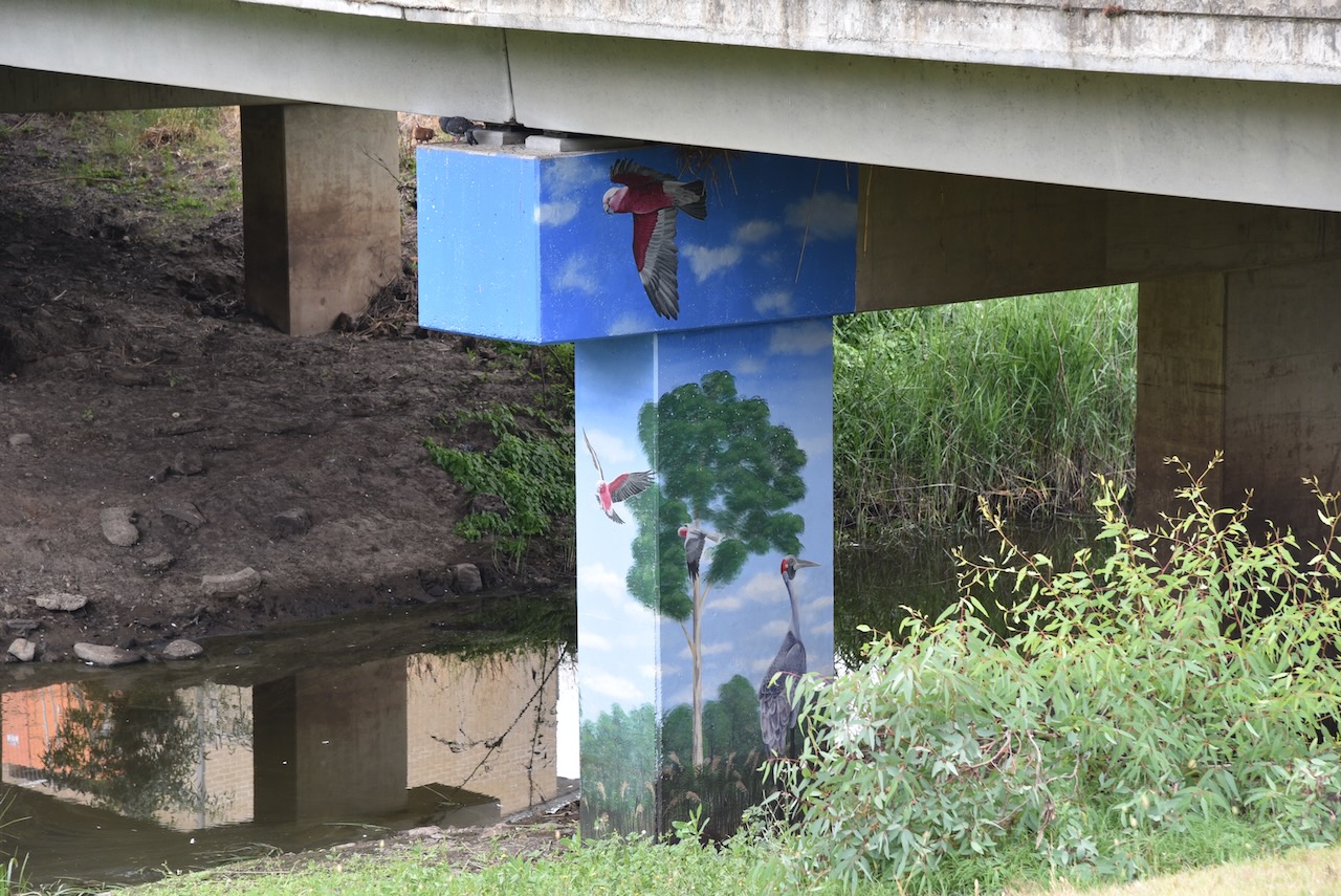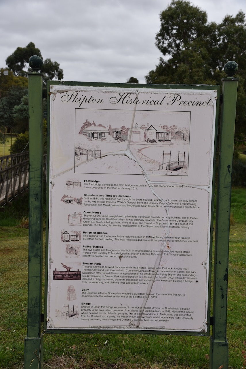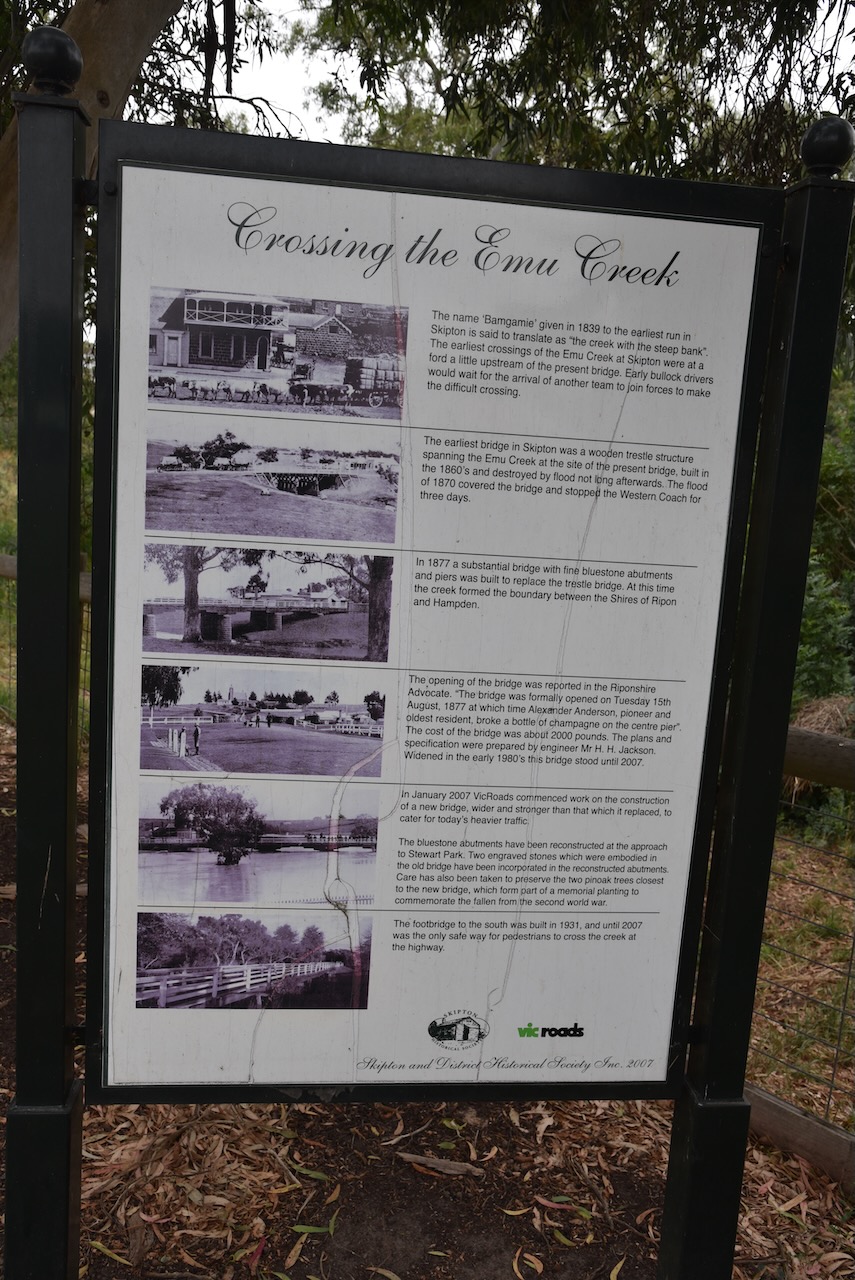 On the bridge that crosses Emu Creek, there is some artwork on the bridge pylons and information boards with history about Skipton.