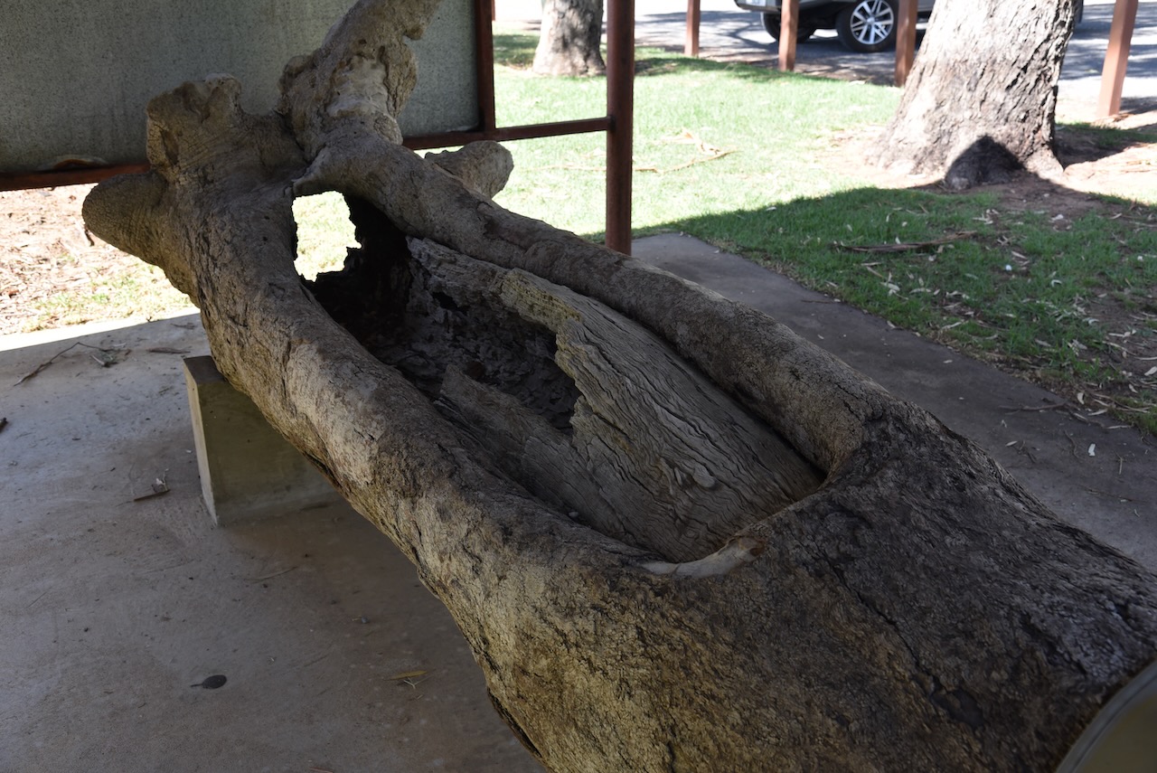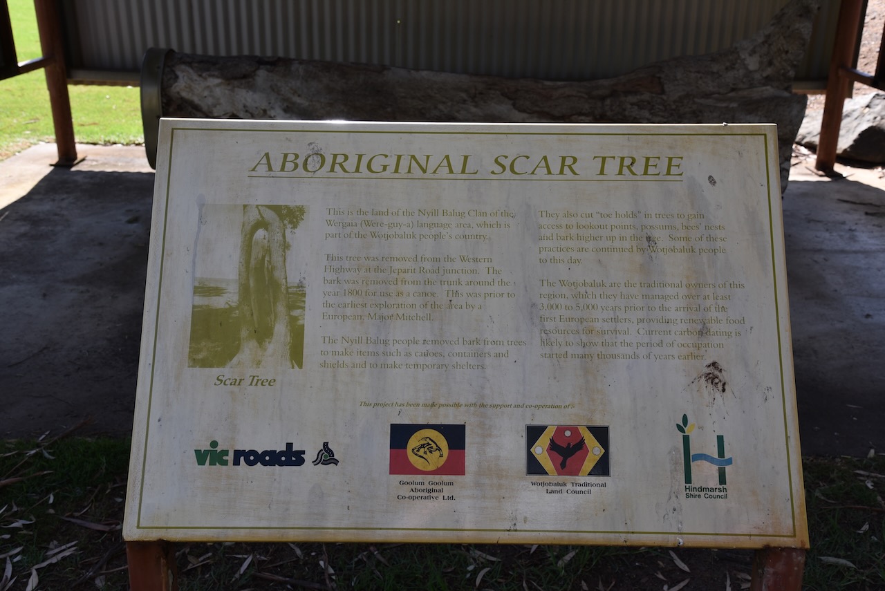 Also at the park, you can find an aboriginal scar tree. It was removed from the Western Highway at the Jeparit Road junction. It is believed the bark was removed from the tree trunk in about 1800 for use as a canoe. This was prior to the earliest European exploration of the area by Major Mitchell.