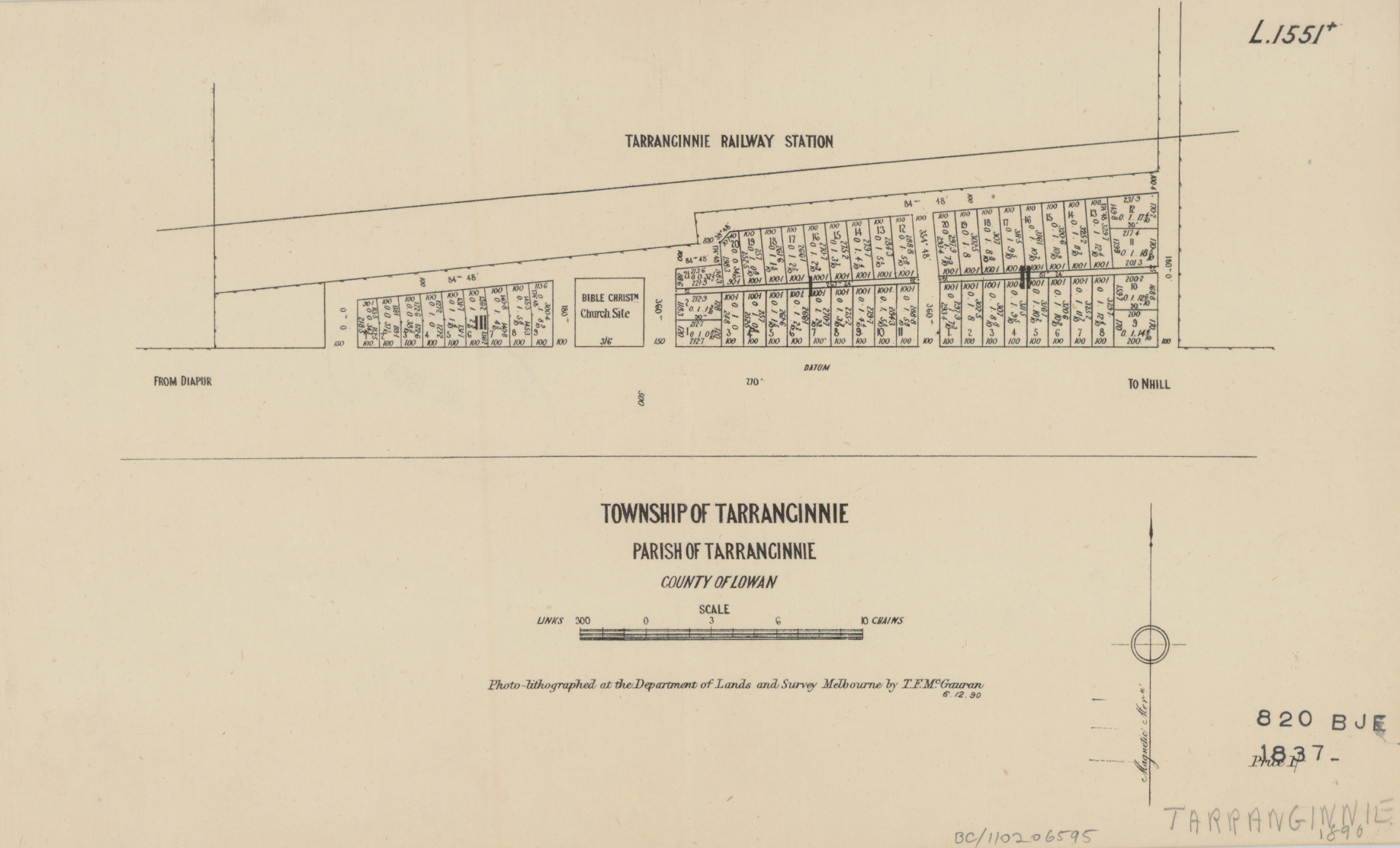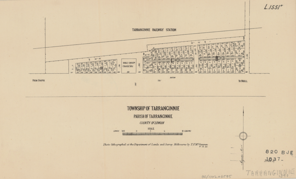 Tarranginne is a rural district about 12 kilometres west of the town of Nhill. It is believed that Tarranginnie is an aboriginal word describing a man with sore feet. European settlement of the Tarranginnie area commenced in the 1870s with wheat-growing areas opened up for farming. In 1870 the Tarranginnie school was opened. By the 1880s there were four schools that carried the name Tarranginnie with a suffix to indicate their direction on the compass. Tarranginnie was located on the railway line from Serviceton to Adelaide which was completed in 1887. By 1890 the town of Tarranginnie was surveyed.