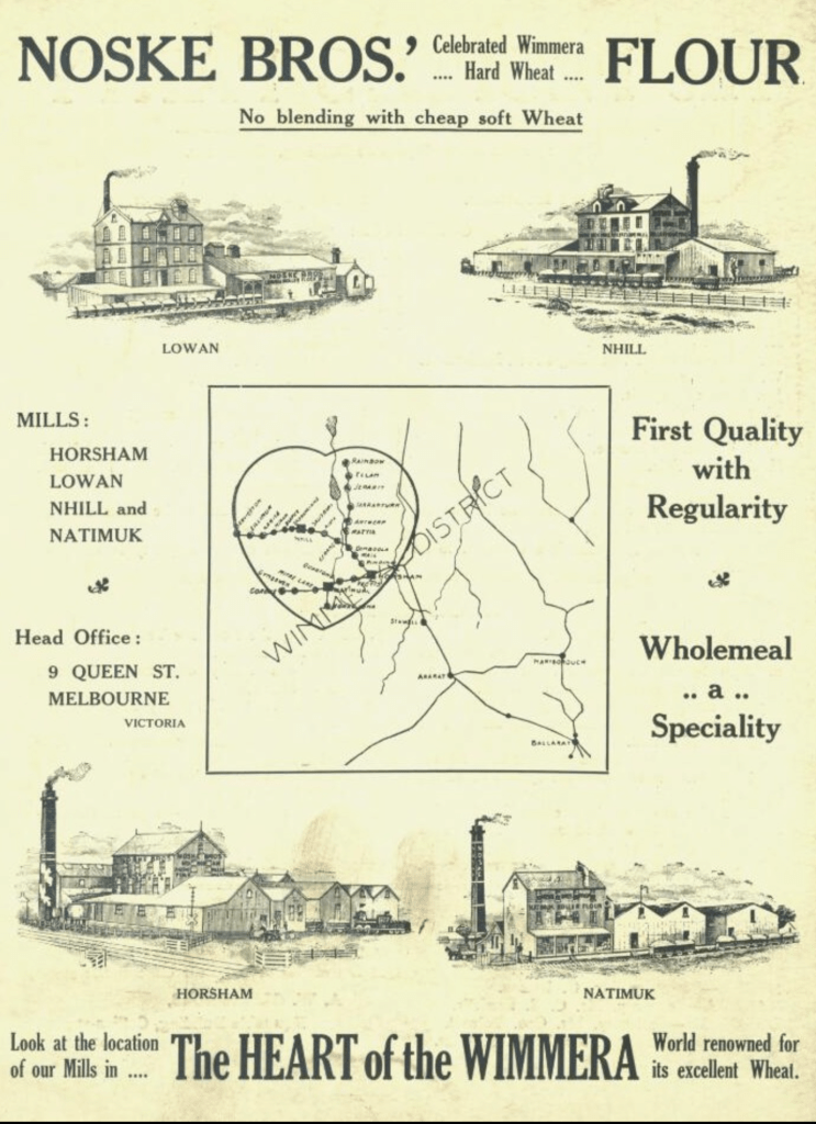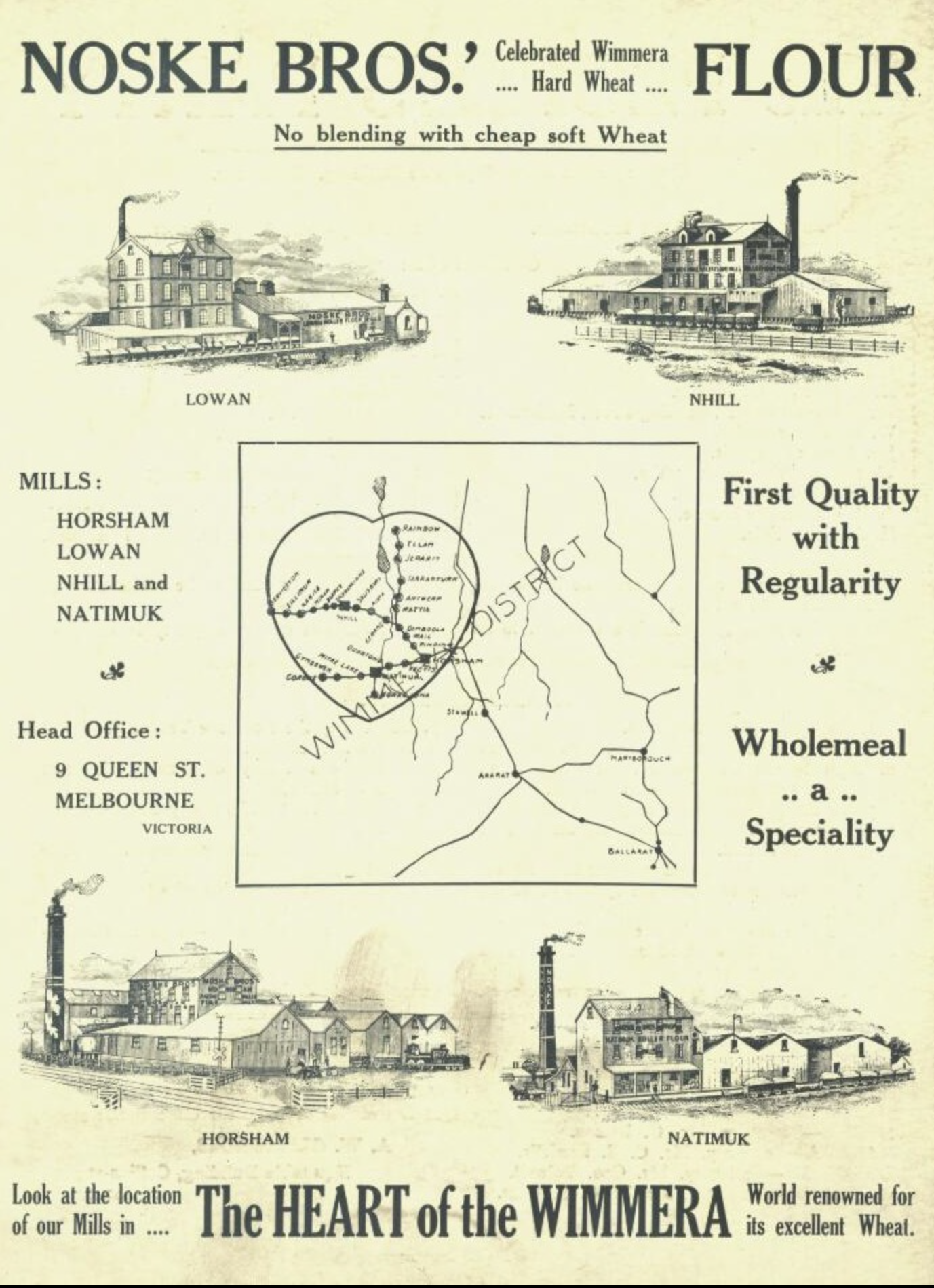In 1900 Traugott Johann Noske (b. 1866. d. 1948) purchased the Horsham flour mill which had been built in 1873 by John Gillies. In 1903 Traugott formed a partnership with W.A. Gunn and W.H. Nichterlein and they purchased a mill at Warracknabeal. In 1905 that mill was sold and the Wimmera and Lowan mills at Nhill were purchased. He also purchased the Arapiles mill at Natimuk which was destroyed by fire in 1920. The company became Noske Bros in 1909 and in 1919 a Proprietary company.