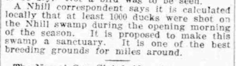 During the 1900s the swamp saw a considerable amount of duck shooting during Duck Season. It was not uncommon for 1,000 ducks to be shot in the opening day. As early as the early part of the 1900s attempts were made to have the swamp declared a sanctuary. Opponents stated that ducks required culling as they destroyed farmer’s crops and that ducks would spread disease amongst the congested wildlife as there were too many ducks.