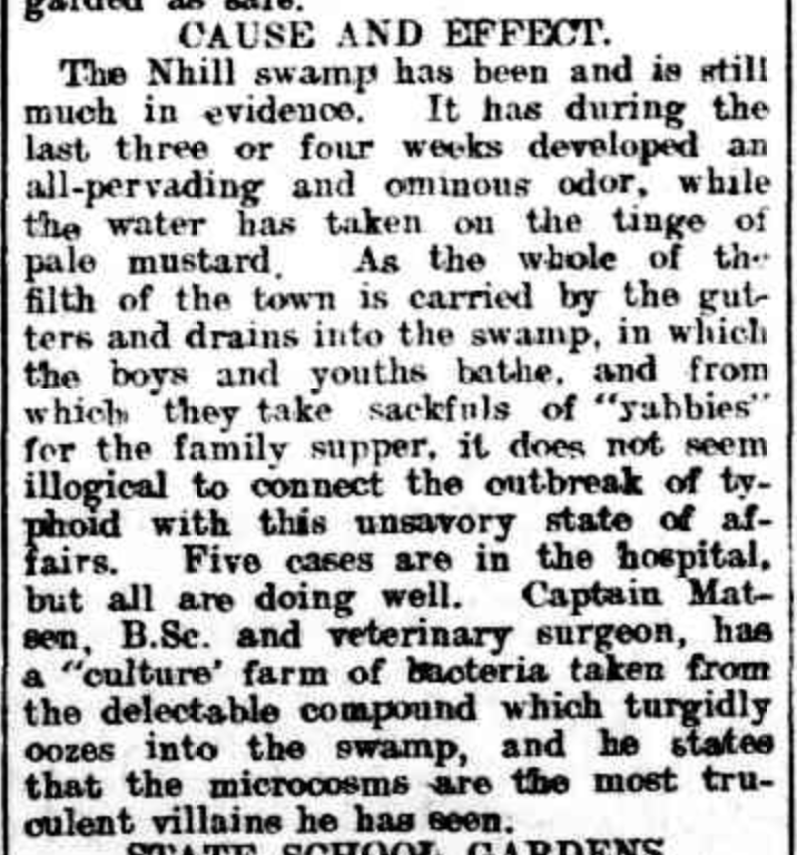 As the whole of the filth of the town is carried by the gutters and drains into the Swamp in which the boys and youths bathe, and from which they take sackful’s of yabbies for the family supper, it does not seem illogical to connect the outbreak of typhoid with this unsavoury state of affairs.