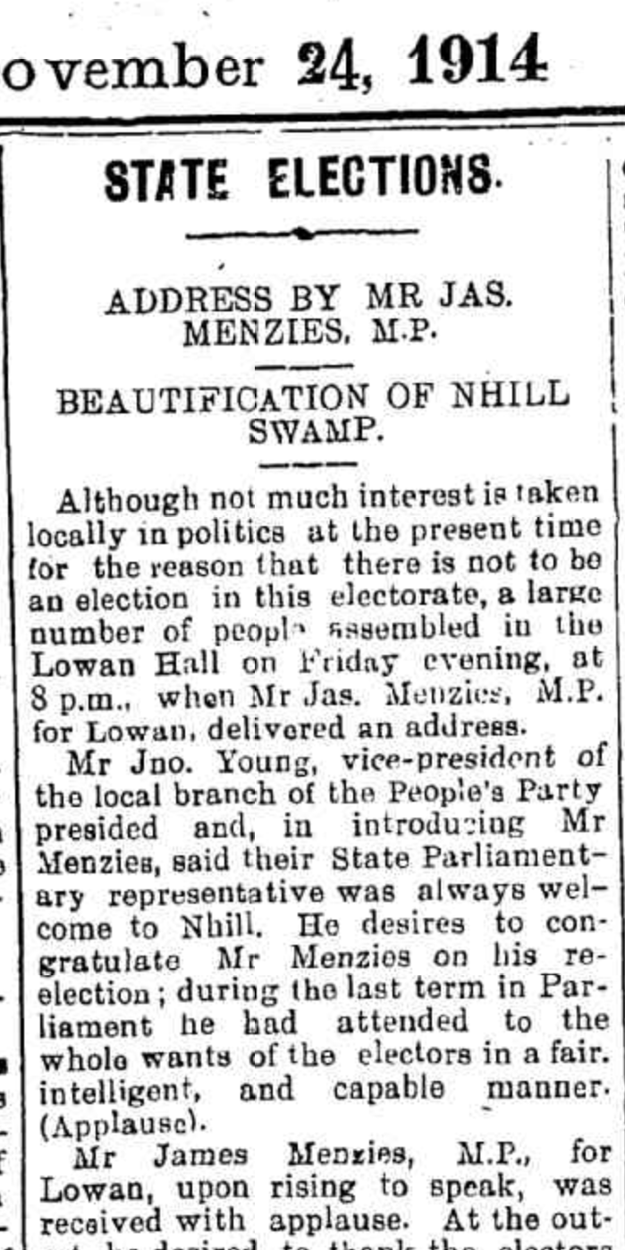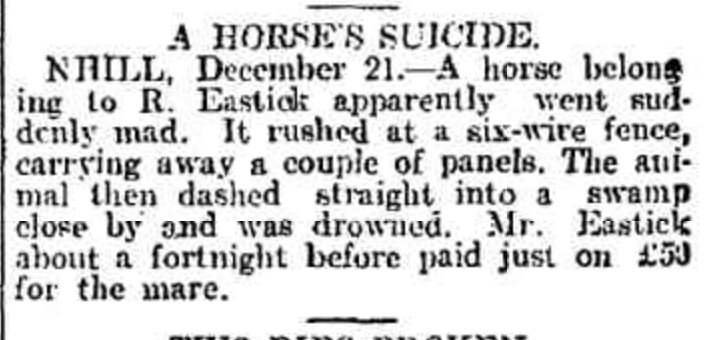 In 1910 the Chronicle reported a ‘horse suicide’ at the swamp, claiming a horse broke through a fence and ‘dashed straight into a swamp close b and was drowned’.