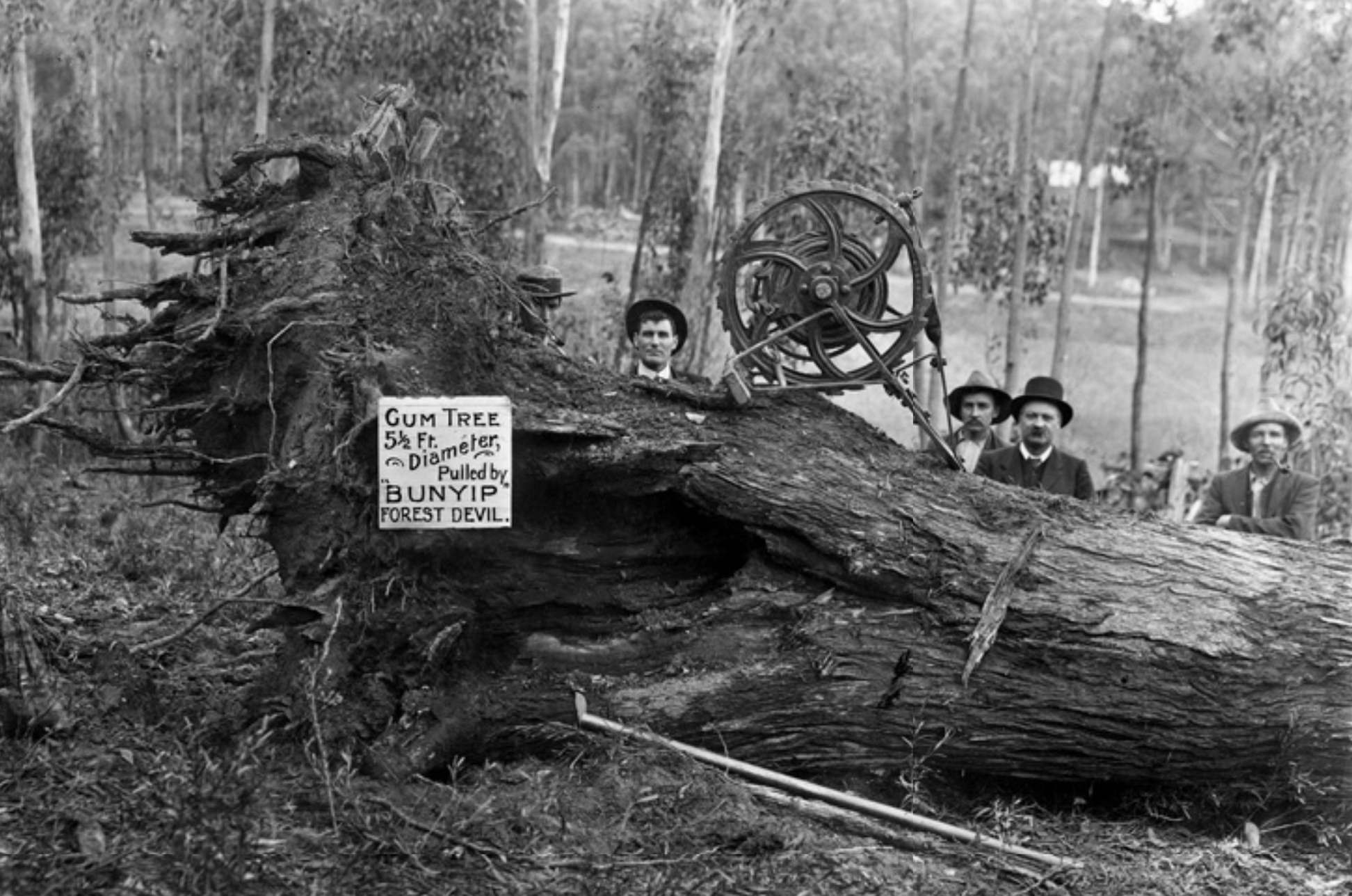 During 1915 the local Council did in fact clear about 32 large gum and box trees from the swamp. They used a ‘Bunyip Forest Devil’ for the job. It was a machine used for light and heavy timber felling. It pulled down a tree by mechanical leverage, sometimes with a winch.