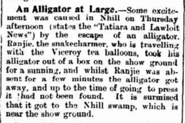 In 1909 an alligator escaped from a sideshow and was found at the Nhill swamp.