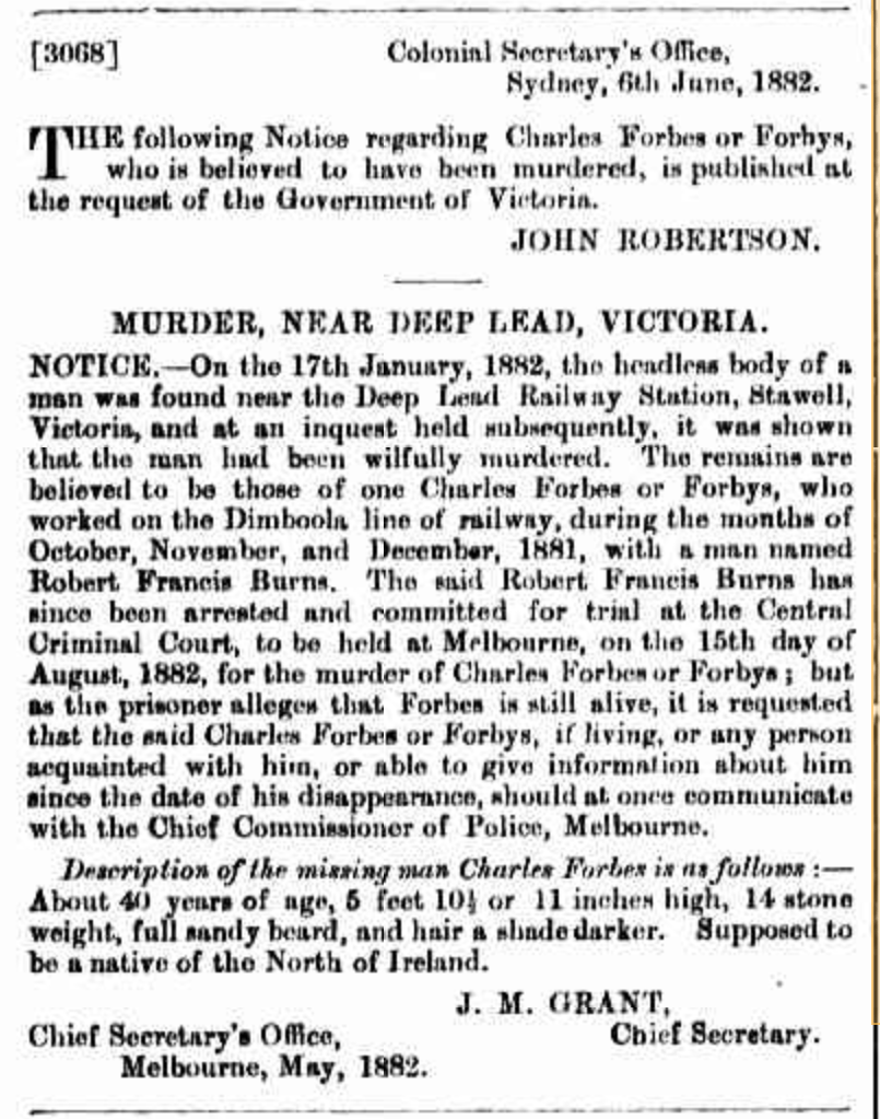 On the 17th day of January 1882, a miner came across the headless naked corpse at Deep Lead. Police subsequently determined that the head of the victim had been severed by ‘some sharp instrument’. A few months later in April 1882, the Police identified the victim as being Charles Forbes aka Scotty or Charley, and that he had last been seen in company with Robert Francis Burns.